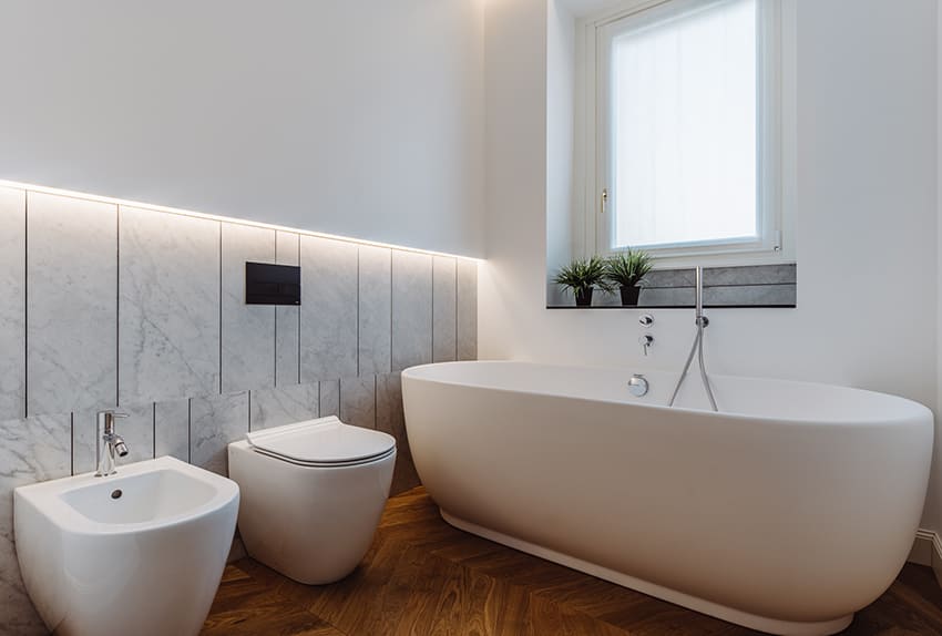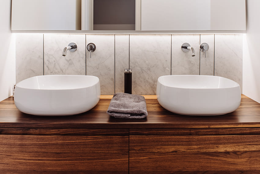 Dalla cucina, attraverso una porta a scomparsa rasomuro, si accede a un’area funzionale con la zona lavanderia. La zona giorno comprende inoltre un bagno per gli ospiti, caratterizzato da Chevron di Salvatori Marmi, nella texture Crema d’Orcia: un motivo spigato a rilievo, ispirato alla finitura Raw di Piero Lissoni e valorizzato da luci e velette, che richiama il disegno della pavimentazione in rovere, posata a spina chevron nell’intero appartamento.