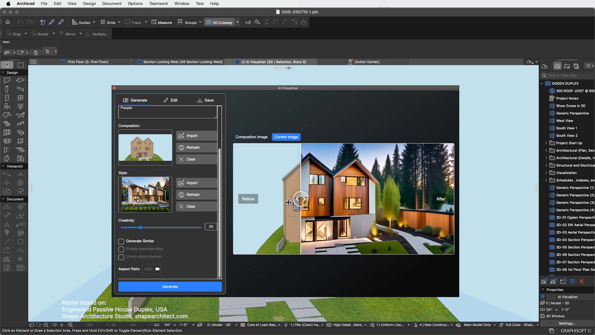 • Integrazione con AI Visualizer – AI Assistant (Beta) si collega direttamente ad AI Visualizer, per ottenere straordinarie visualizzazioni dai modelli utilizzando semplici comandi di testo. AI Visualizer 2.0 in Archicad consente agli utenti di creare immagini con comandi, regolare lo stile e la creatività e generare risultati istantanei. Confronta il prima e il dopo con un cursore, utilizza uno strumento pennello per modificare aree specifiche e salva le immagini finali direttamente in Archicad.