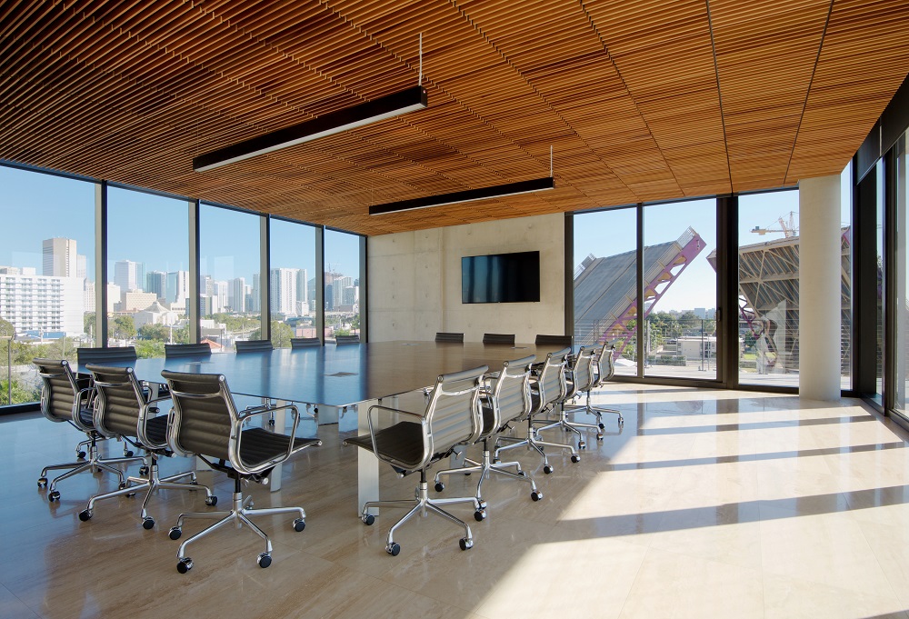 All’interno, il programma è molto semplice e include spazi per uffici sia open space sia separati, studi, sale conferenze, salotti, aree comuni e parcheggi. I primi due livelli ospitano posti auto, la reception con lobby e sala conferenze, e i locali tecnici. Il terzo livello contiene uffici, una sala conferenze, una cucina con lounge e una generosa balconata con vista sul Miami River. All’ultimo livello si trovano gli uffici più larghi, intervallati da sala d’attesa e sale conferenze, di cui una molto grande, servita anch’essa da un’ampia loggia sempre sul lato fiume.