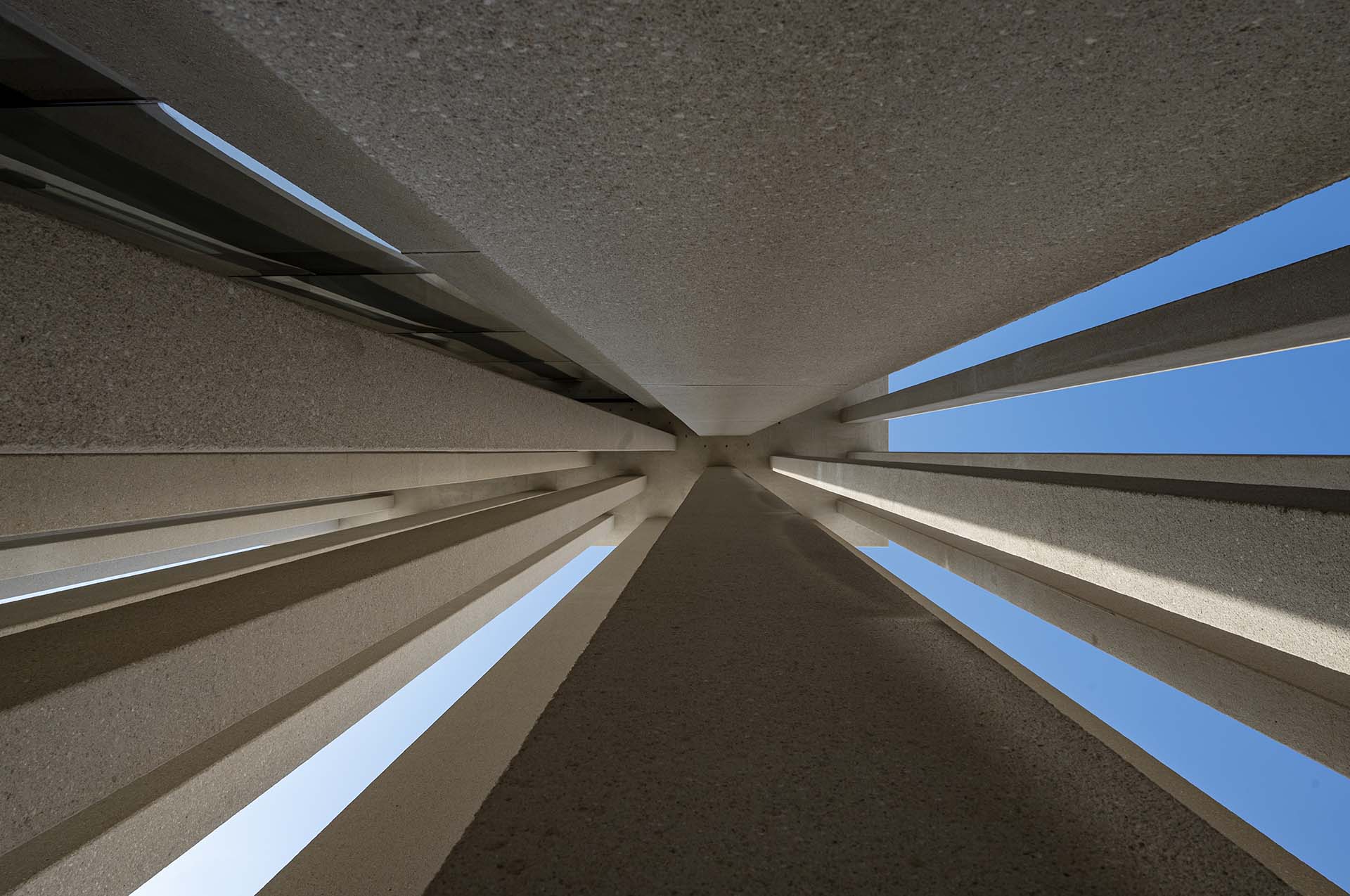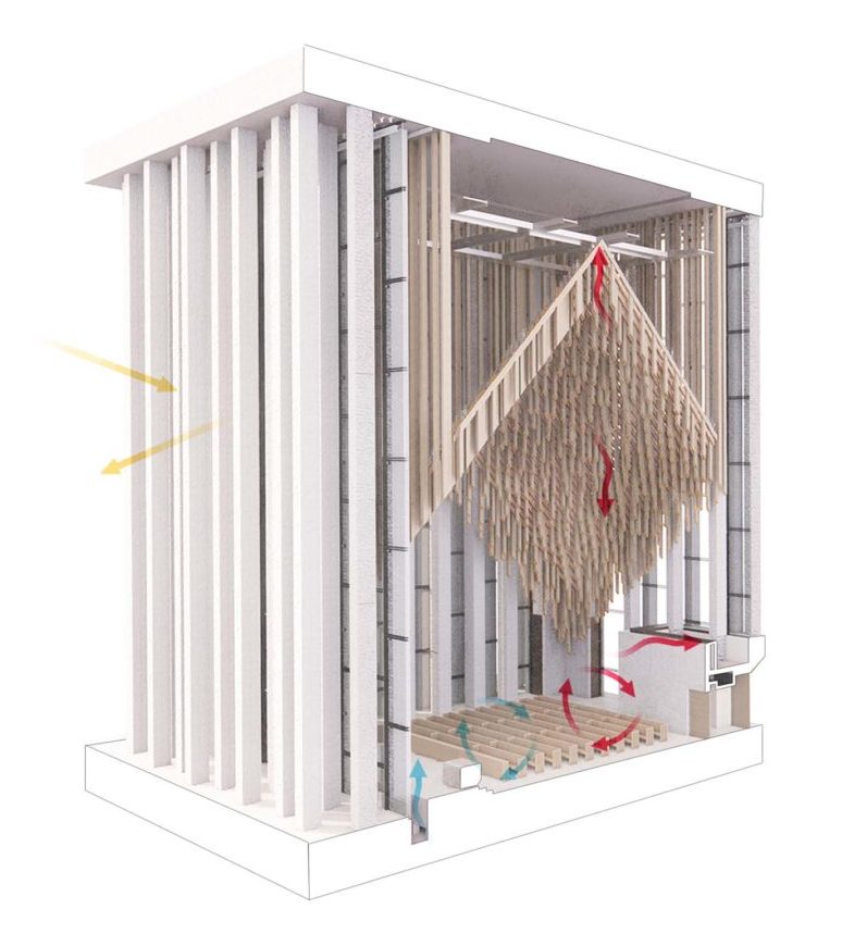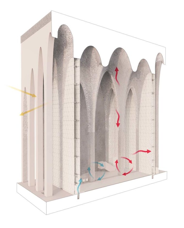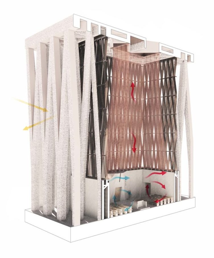 Le colonnate e i frangisole degli edifici sono stati calibrati attraverso studi termici per bilanciare ombreggiamento, illuminazione naturale e riduzione del guadagno termico.