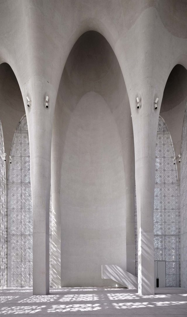 La moschea si distingue per la presenza di mashrabiya, reticoli traforati ispirati alla tradizione architettonica islamica, storicamente usati per regolare la luce e l’aria e proteggere la privacy degli ambienti interni.