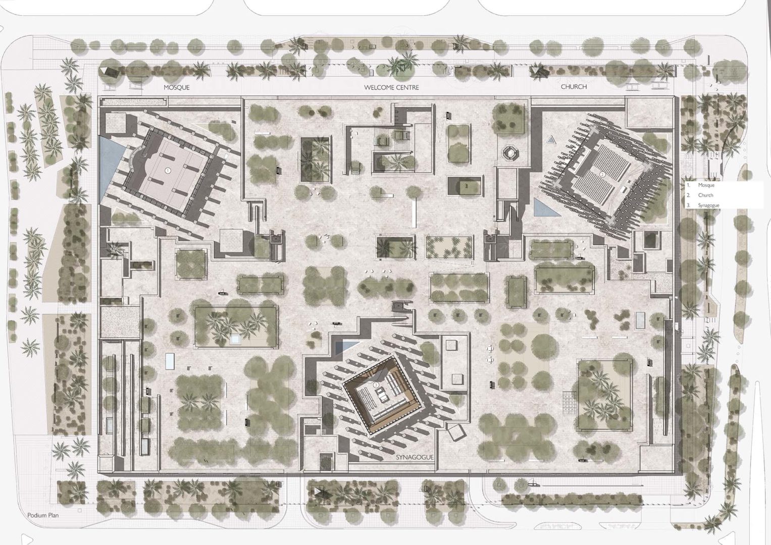 Luoghi di culto: ciascuno degli edifici è un volume cubico che misura 30x30x30 metri. I cortili interni di ciascun edificio misurano: moschea 1.322 m²; chiesa 1.170 m²; sinagoga 1.110 m²