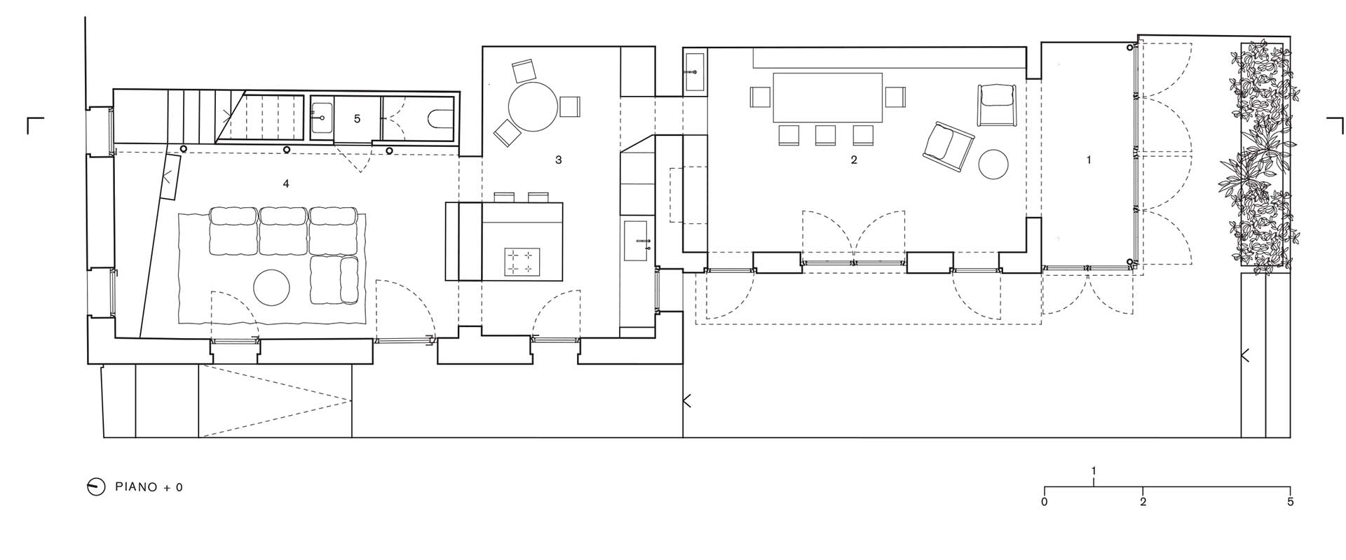 Una delle aperture preesistenti, posta sul perimetro in uno dei due lati corti, viene rimodulata per rendere possibile un ampliamento del piano terra, sia visivo sia fisi­co, creando una connessione diretta fra interno ed esterno. Il nuovo elemento di passaggio è una sorta di bow-window che abbraccia la testata e il lato lungo del corpo minore.