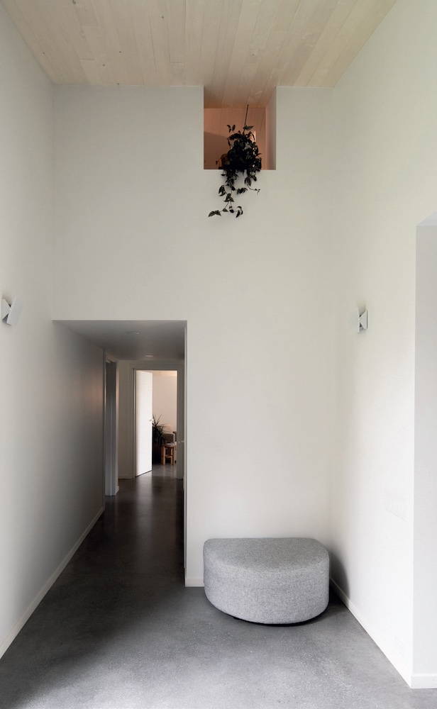 Atelier C presenta una planimetria a «L» e un involucro essenziale: la copertura, ventilata, è rivestita in lamiera grecata mentre la parte sottostante è in pioppo sbiancato. Le facciate sono realizzate in listelli di legno di cedro carbonizzato che avvolgono il volume, ritmato sul fronte nord da strette aperture verticali vetrate che sembrano creare un colonnato contemporaneo e rigoroso. Sul fronte sud, invece, le finestre sono più ampie per consentire l’apporto di luce naturale agli spazi di lavoro. Gli interni, al contrario, sono strutturati in modo fluido e si presentano chiari e luminosi, con la sola eccezione dello spazio cucina, che richiama la cromia dell’involucro.