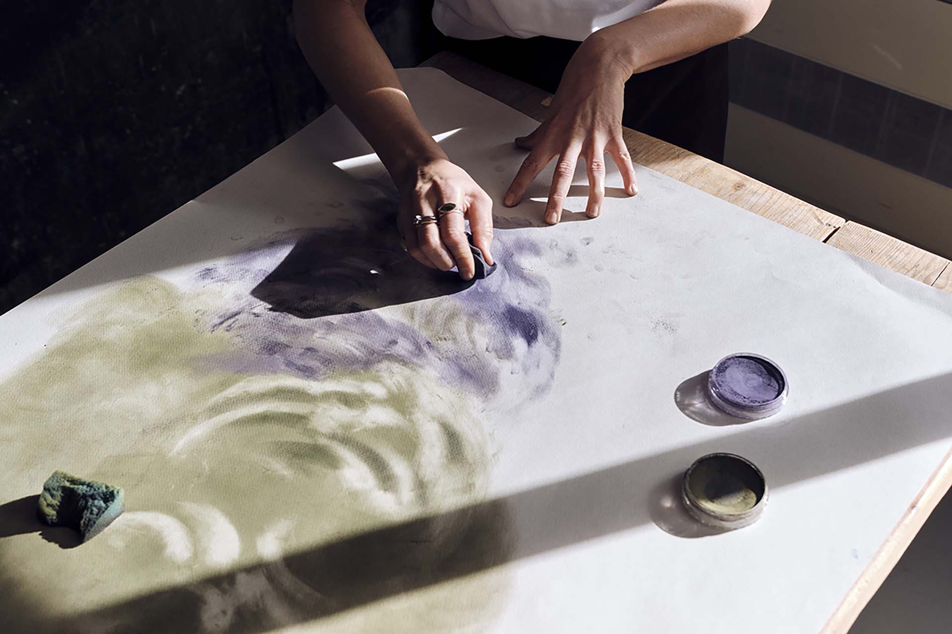 Realizzati a mano con colori polverosi e sottrazioni materiche, i pattern rivelano la fonte luminosa proprio dove il colore si ritrae.