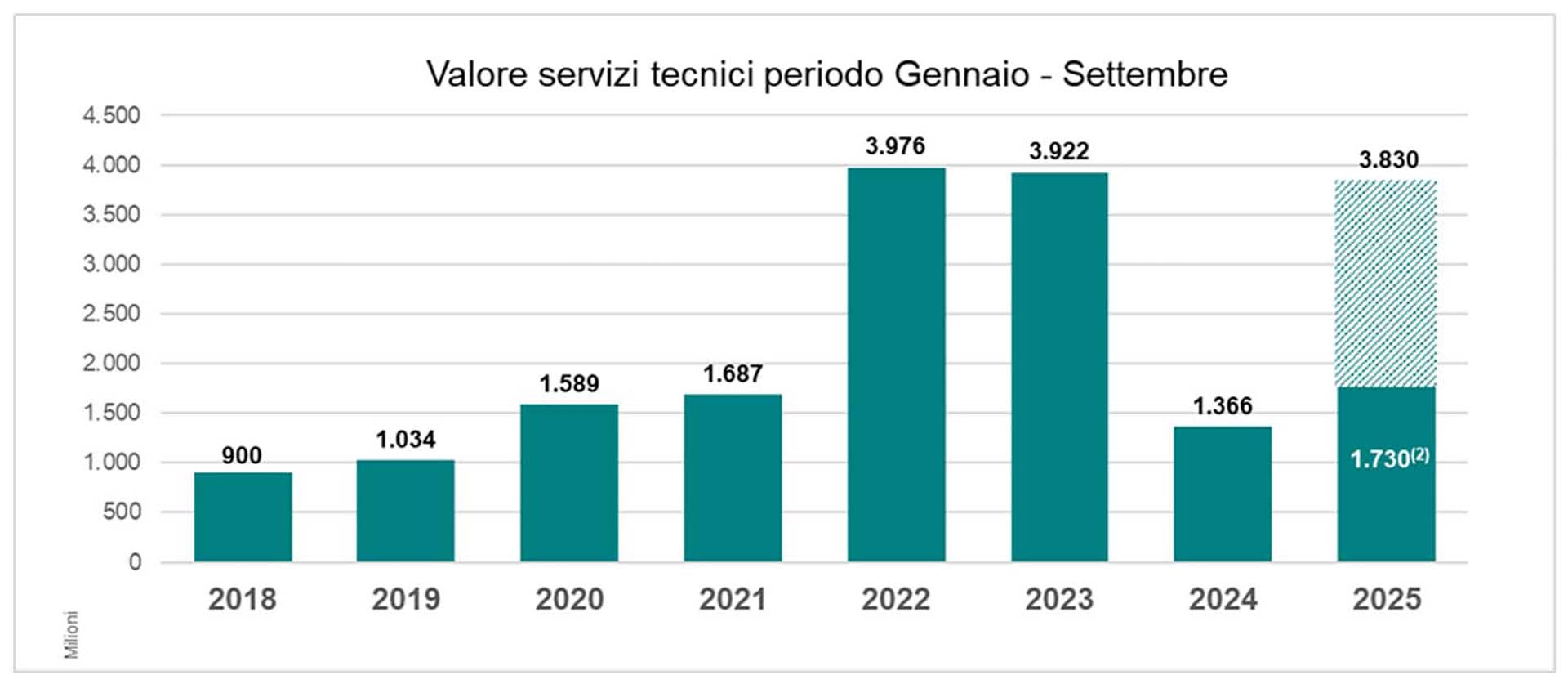 Nei primi nove mesi del 2025, il valore della progettazione esecutiva inclusa negli appalti integrati è stato di 126,6 milioni di euro, in calo del 35,7% rispetto al 2024, mentre il numero dei bandi è stato di 552, con una lieve flessione del 5,5%.