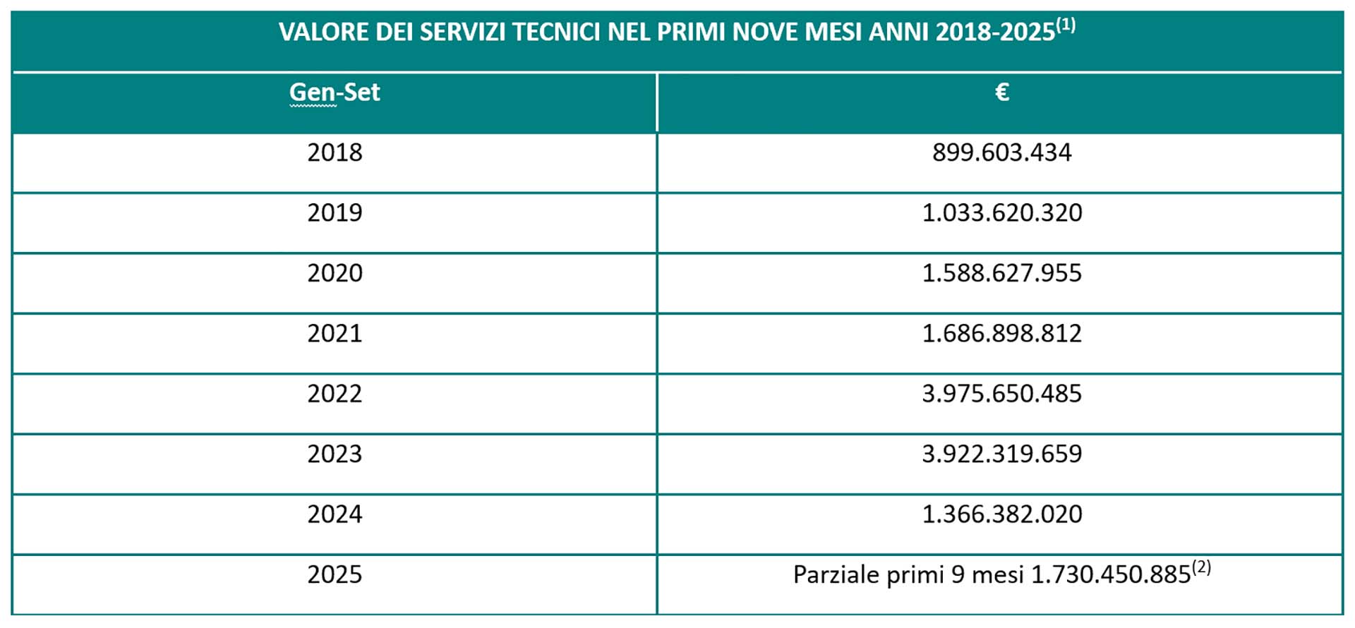 Secondo l’Osservatorio gare Oice, l’associazione che rappresenta le società di ingegneria e architettura aderenti a Confindustria, i primi nove mesi dell’anno registrano un incremento del 26,6% rispetto allo stesso periodo del 2024, con un valore complessivo che supera 1,7 miliardi di euro, contro gli 1,4 miliardi dell’anno precedente.