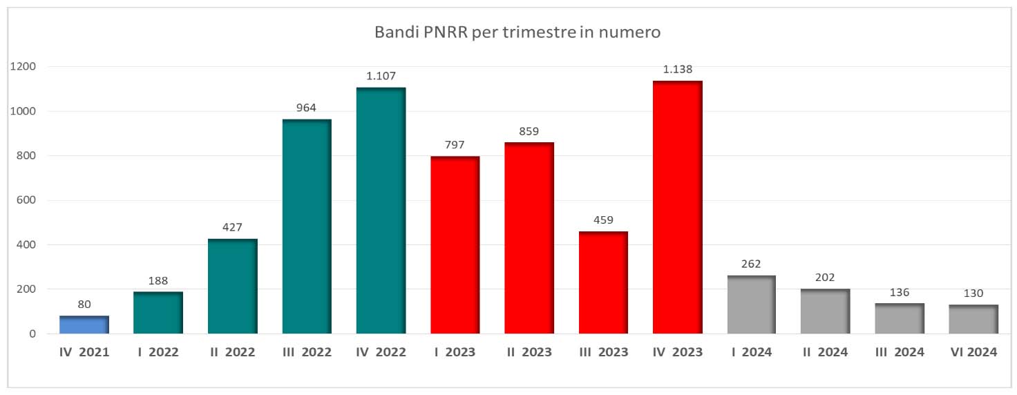 In quest’occasione è quindi possibile tracciare un primo bilancio sul 2024 che ha visto pubblicati 730 bandi per un valore di 282,5 mln. Il confronto con il 2023 vede un forte calo in valore (-81,3%) e in numero (-77,6%). Il quarto trimestre ’24, con 130 bandi da 45,6 mln, fa registrare un calo del 79,4% in valore e dell’88,6% in numero sul quarto trimestre ’23.