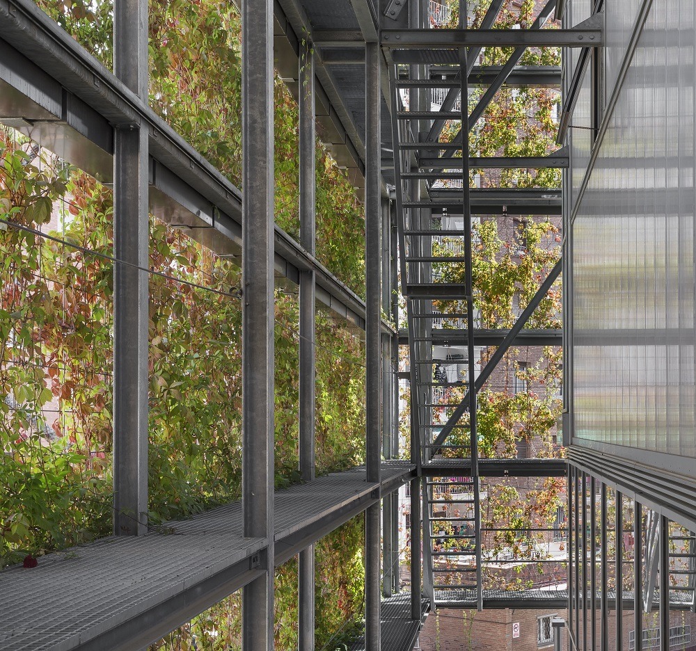 Il prospetto verso Sant Isle Street ha un carattere urbano, caratterizzato da un portico ad angolo che estende il marciapiede e invita lo spettatore ad entrare, mentre sugli altri lati l’edificio è circondato da una cortina verde che protegge le facciate dal sole e allo stesso tempo crea uno spazio bioclimatico.