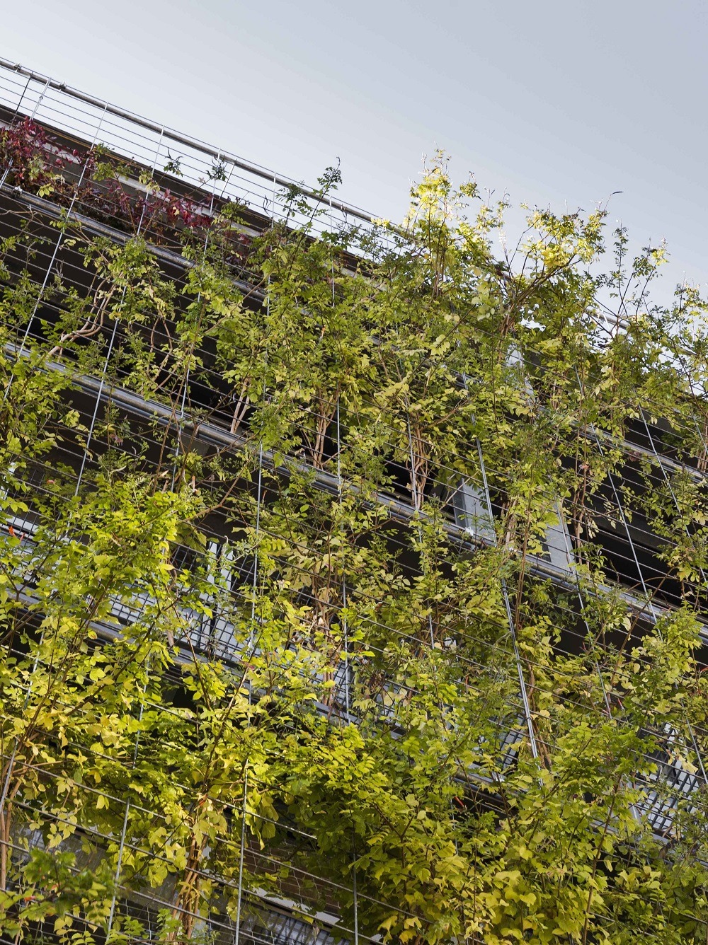 Un grande serbatoio situato nel seminterrato raccoglie l’acqua piovana per il riciclaggio e la utilizza per l’intera irrigazione della facciata verde attraverso un sistema idroponico. Come scheletro portante è stato scelto un sistema prefabbricato in legno laminato, per le prestazioni meccaniche, la leggerezza e la sua velocità di assemblaggio, che ha garantito la costruzione della struttura in solo otto settimane. Infine, i pannelli fotovoltaici occupano l’intero tetto, generando 95.534 kWh all’anno.