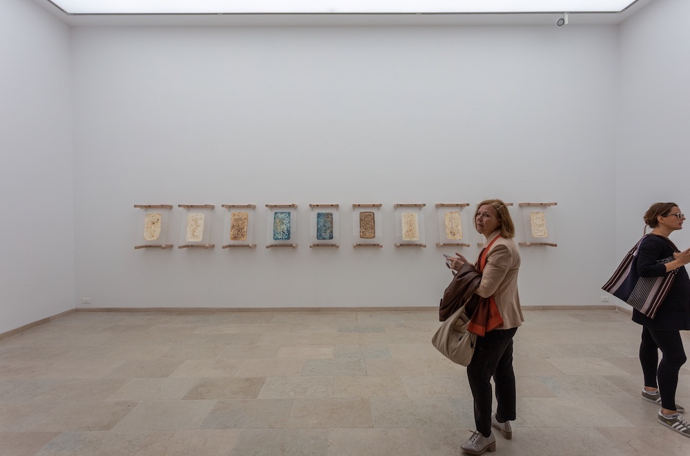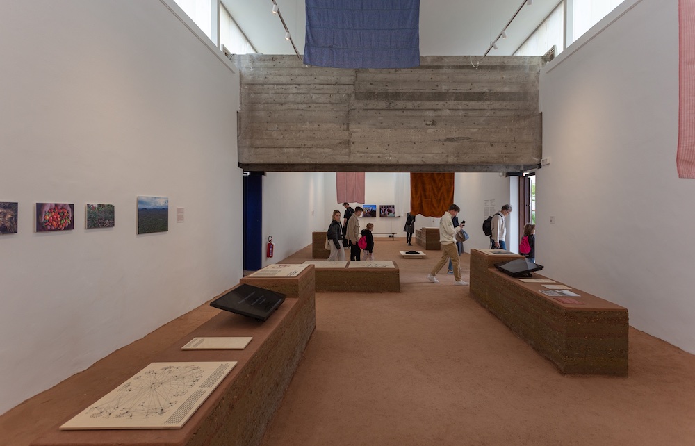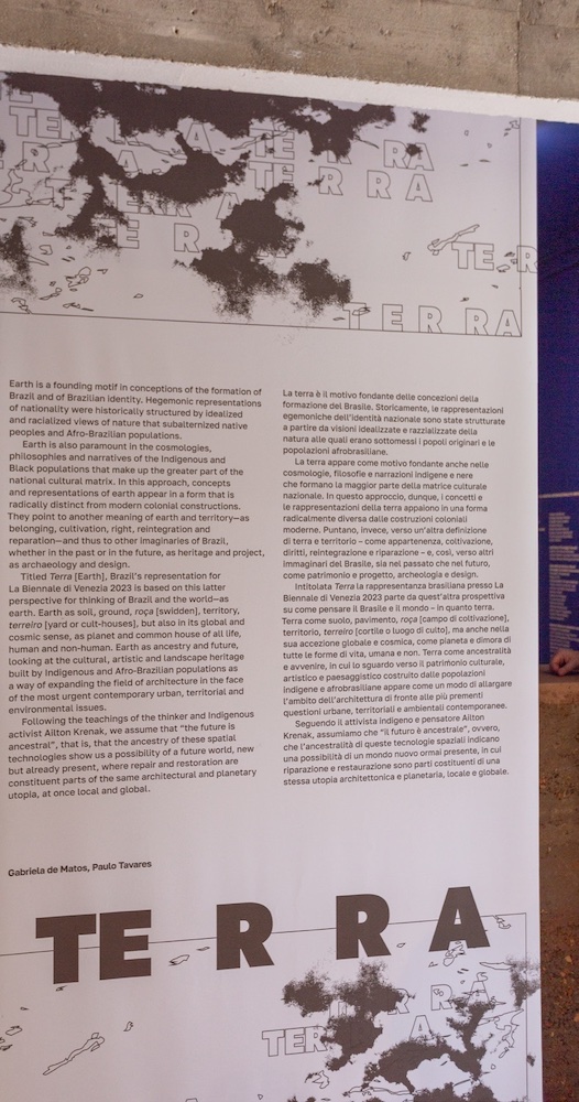 Vincitore del Leone d’Oro per la miglior Partecipazione Nazionale, il Padiglione brasiliano presenta Terra, il progetto curatoriale che pone la polisemica natura della terra al centro dell’attenzione. Si parte da una critica non convenzionale alla fondazione della capitale Brasilia, celebrata dalla narrazione mainstream come mirabile attuazione dei principi del Moderno e qui presentata come violento atto di colonizzazione. La narrazione prosegue attraverso contenuti multimediali che allargano la frattura tra cultura afrobrasiliana e canone occidentale. Tale distanza rimane tangibile in tutto l’allestimento anche se, nella seconda sala, una possibilità di dialogo tra identità, incarnata dai tessuti tradizionali appesi, e modernità, l’architettura del padiglione, si dipana in uno spazio libero, inondato da un pavimento in terra compattata da cui emergono senza soluzione di continuità volumi espositivi. La terra custodisce i segni delle civilizzazioni e, allo stesso tempo, offre la memoria ancestrale per dare nuovi significati e futuri alternativi alle specie viventi che la abitano.