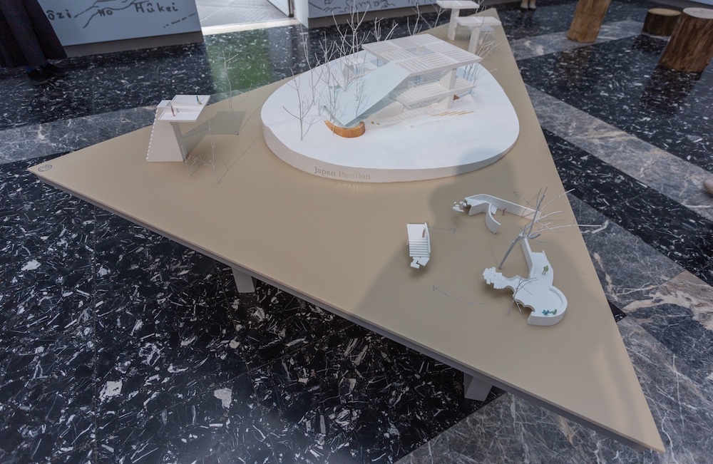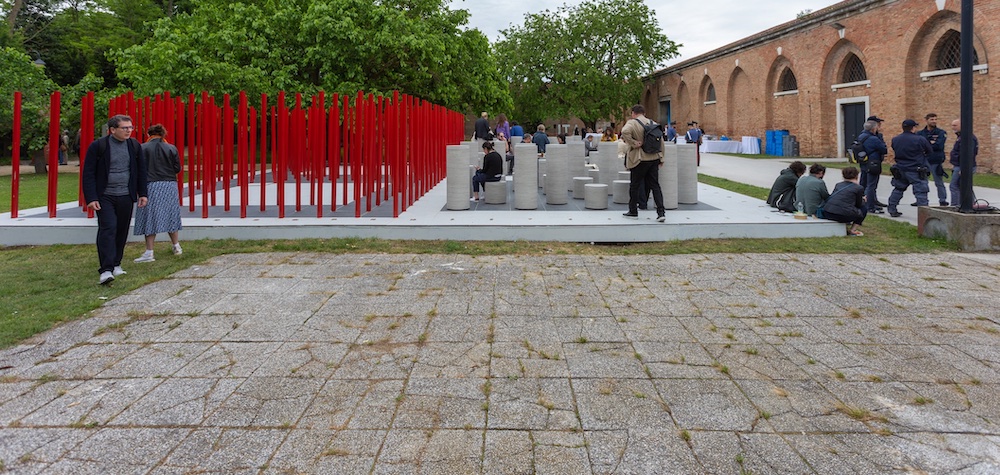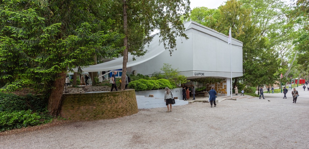 Insieme a quello austriaco, il padiglione del Giappone imposta una riflessione sulla propria architettura, la sua genealogia e la sua traiettoria evolutiva. Compare una tenda diafana che, come nel progetto originario non interamente realizzato di Takamasa Yoshizaka, rafforza il legame tra edificio e spazio aperto circostante. Varcata la soglia, l’architettura racconta sé stessa attraverso una narrazione tematica da cui riaffiorano le idee che l’hanno fatta nascere e il processo costruttivo che l’ha depositata nei giardini della Biennale. L’architettura è una sorta di creatura vivente con una vita propria che, in continuità rispetto alla partecipazione del 2021 Co-ownership of Actions: Trajectories of Elements e come scriveva Rafael Moneo ne La solitudine degli edifici, va costantemente ri-scoperta, vissuta, e adattata alle necessità del presente. Il piano inferiore, pilotis, come lo chiamava Yoshizaka, ospita un luogo di riposo e di incontro simile a un bar, uno spazio dove i visitatori troveranno riparo dal sole cocente dell’estate in laguna.