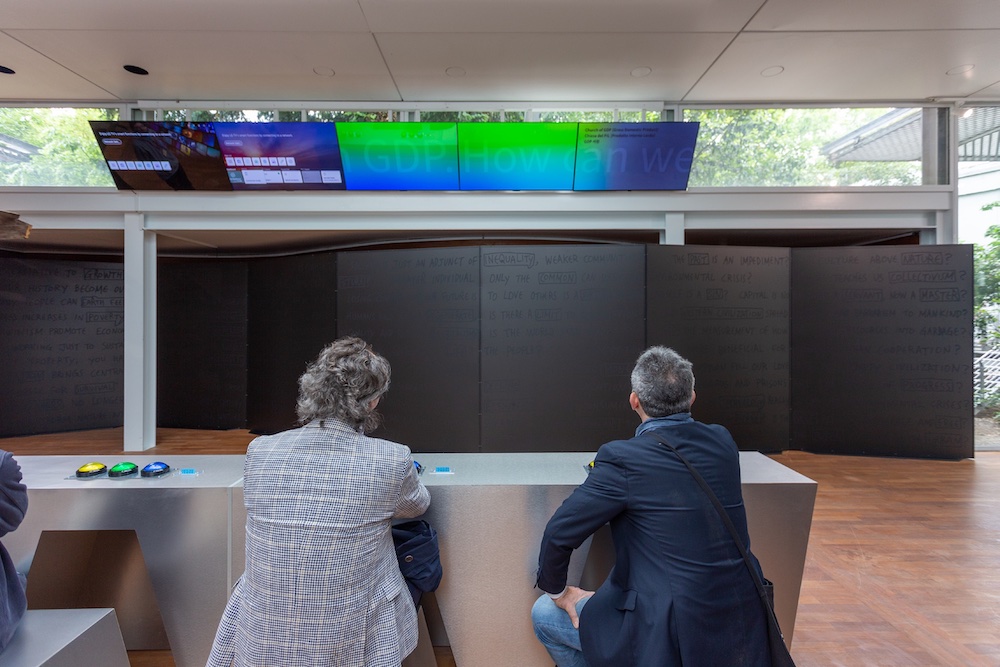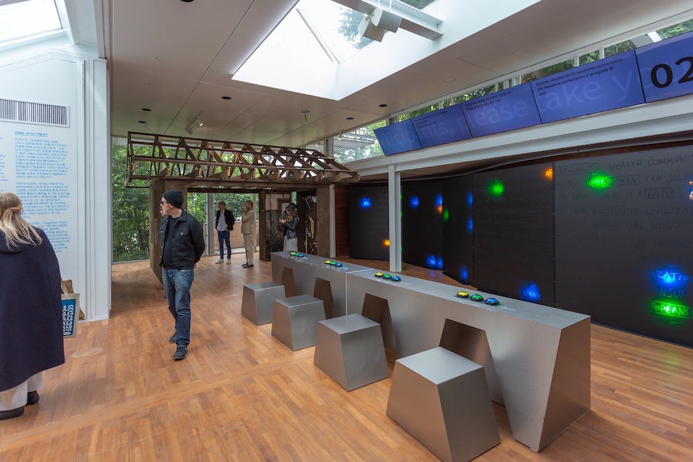 Nel 2086 la popolazione mondiale raggiungerà il picco, e i nostri atteggiamenti predatori verso il pianeta ci avranno messo nei guai, come possiamo lavorare insieme per affrontare le sfide di oggi e di domani? Il padiglione coreano articola la critica all’ideologia faustiana in una serie di tappe che inscenano situazioni di crisi in diversi contesti. La principale è il quiz televisivo The Game of Together How, un gioco che ci pone di fronte alle contraddizioni dell’estrema connessione tecnologica e le simultanee crisi ambientali, culturali, sociali. Domande grottesche e black humor ci impongono di prendere posizioni estreme, mettendo in risalto quanto l’esistenza di un futuro dipenda dalle scelte che si compiono ogni giorno, a cui non possiamo sottrarci. Geniale, ma l’architettura?