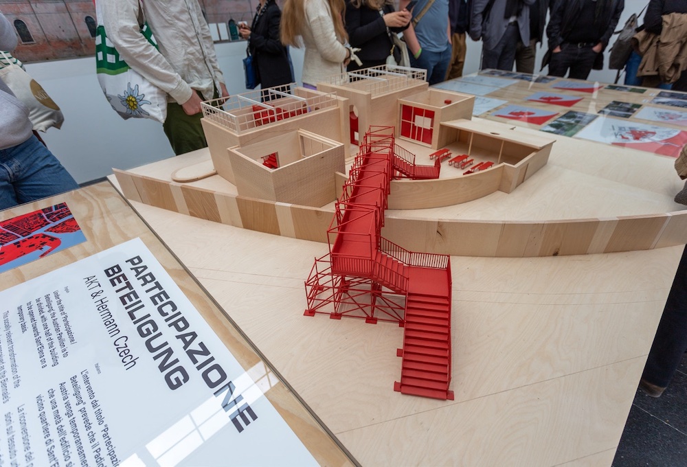 Qual è il rapporto tra Venezia e le sue biennali di arte e architettura? Lo spiegano i curatori del padiglione austriaco, che accendono le luci dei riflettori sul processo di erosione del tessuto sociale della città incentivato dalle stesse mostre internazionali. Venezia è sempre meno dei veneziani e sempre più dei turisti. Le Biennali contribuisco concettualmente e fisicamente, attraverso la crescente occupazione di spazio e la relativa sottrazione all’uso pubblico, alla crescita di una tendenza che sembra inarrestabile, guardando i numeri della popolazione residente e dei visitatori. Come il Giappone, anche l’Austria lavora quindi sull’architettura del proprio spazio rappresentativo, mettendo in discussione la brandizzazione di una città sempre più ostile ai suoi abitanti. Tuttavia, la proposta di dedicare metà del padiglione alla comunità di Sant’Elena mediante una passerella temporanea è respinta, e quello spazio dedicato ai residenti, allestito per ospitare momenti di dibattito e confronto, rimane oggi un vuoto che fa rumore, un’occasione mancata, una provocazione che sembra affermare che se la Biennale non è per i veneziani, allora non è nemmeno per i visitatori. Quello che viene esposto è la testimonianza di un percorso partecipativo e di un progetto per una Biennale altra.