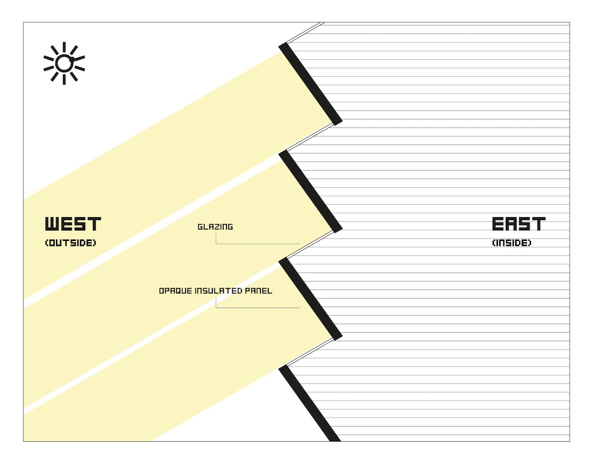 Il dettaglio delle facciate messo a punto prevede un sistema seghettato, a mo’ di ventaglio, dato dall’accostamento in orizzontale dei due elementi che corrono su tutta la verticalità dell’edificio: uno opaco e uno trasparente. I due pannelli sono ruotati di 45 gradi rispetto al filo della facciata e tra loro formano un angolo retto, in modo tale che la parte opaca sia sempre orientata verso Sud per proteggere l’interno dal carico termico apportato dalla radiazione solare.