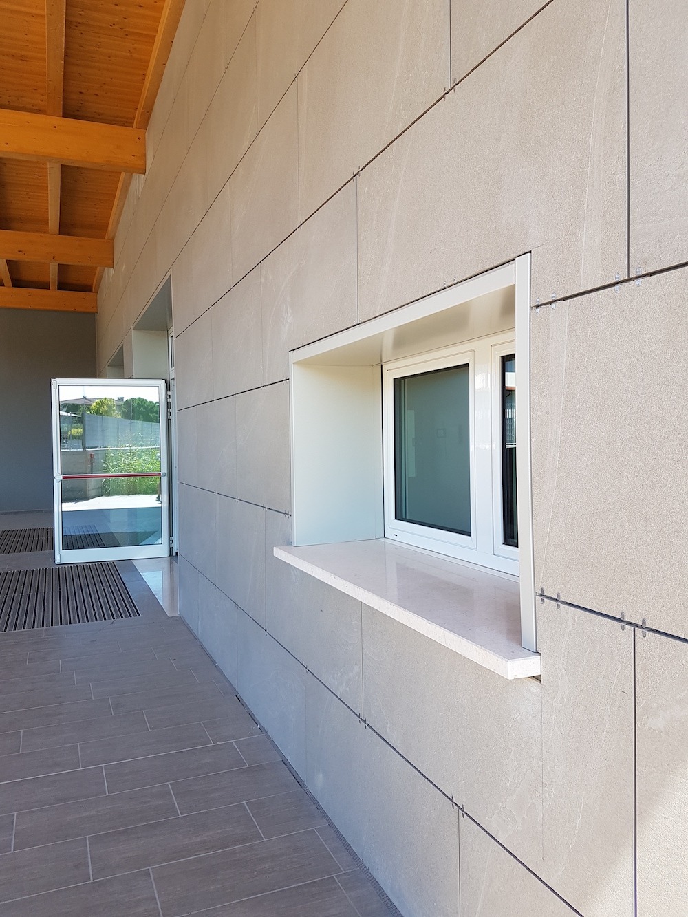 Il sistema Isotec Parete, con uno spessore di 100 mm, è risultato estremamente funzionale alla posa del rivestimento in lastre 120×60 cm in grès porcellanato di Emilgroup, ancorato ai correnti metallici con morsetti in acciaio a vista. Particolare la metodologia di posa delle lastre a giunti sfalsati, che si è rivelata semplice e veloce grazie alla versatilità del sistema Isotec Parete.