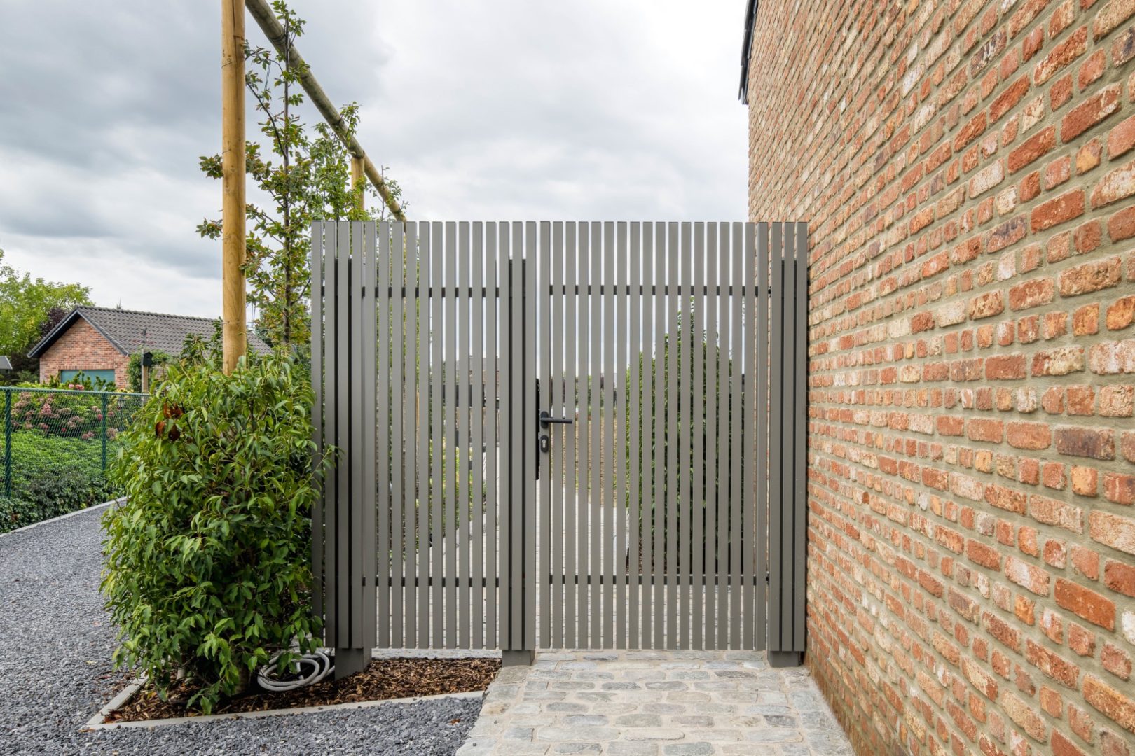 Realizzate in acciaio o alluminio, queste recinzioni si distinguono per la loro essenzialità formale: profili verticali regolari, proporzioni equilibrate e colorazioni neutre che spaziano dal nero intenso al grigio opaco.