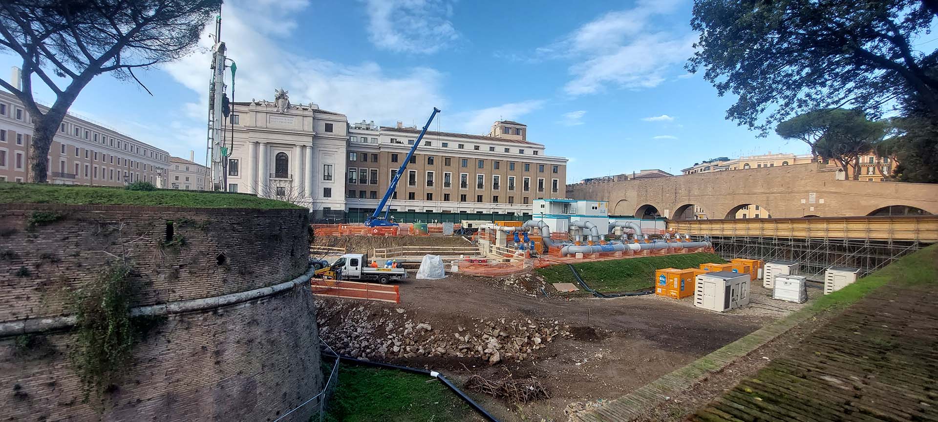 Gli scavi nell’area di Piazza Pia, necessari alla realizzazione della nuova rampa di imbocco, sono stati contenuti lateralmente da dei pali trivellati di diametro φ800, disposti a un interasse di 90 centimetri in modo da limitare al massimo i volumi e l’ingombro planimetrico degli scavi.