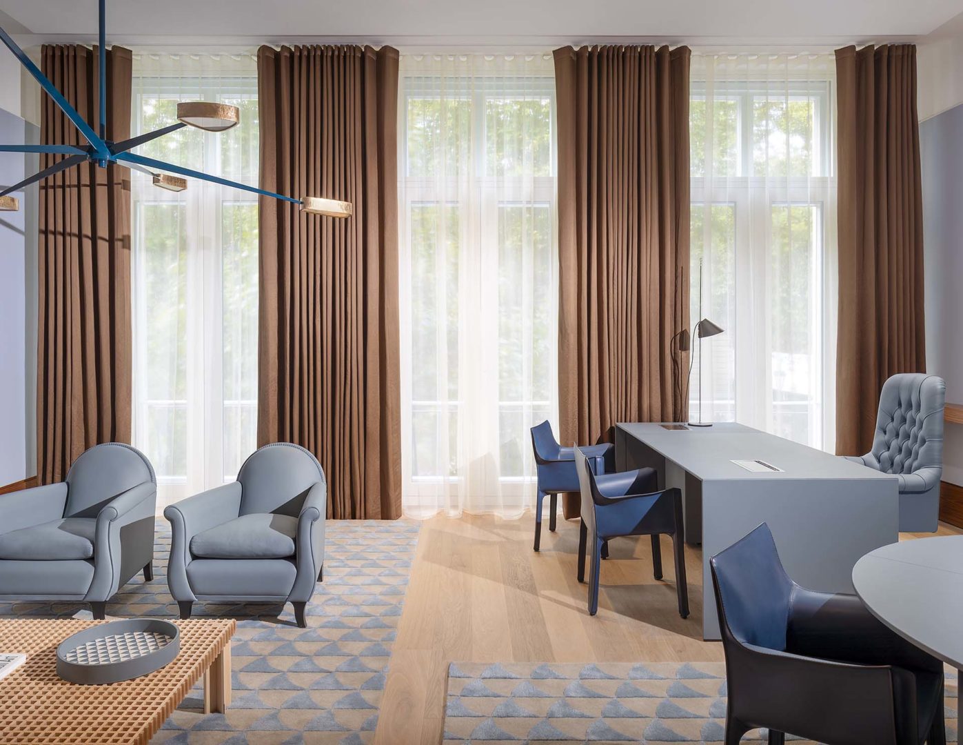 La selezione degli arredi attraversa generazioni e linguaggi del design italiano: Gio Ponti, Vico Magistretti, Franco Albini, Luigi Caccia Dominioni, Mario Bellini, Piero Lissoni, Antonio Citterio e Michele De Lucchi, insieme a figure internazionali. Gli ambienti direzionali, tra cui gli uffici dell’Ambasciatore e del Vice Capo Missione, sono rivestiti in impiallacciato Alpi prodotto da Saporiti, che firma anche le cabine degli ascensori.