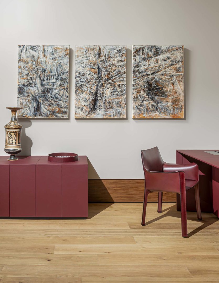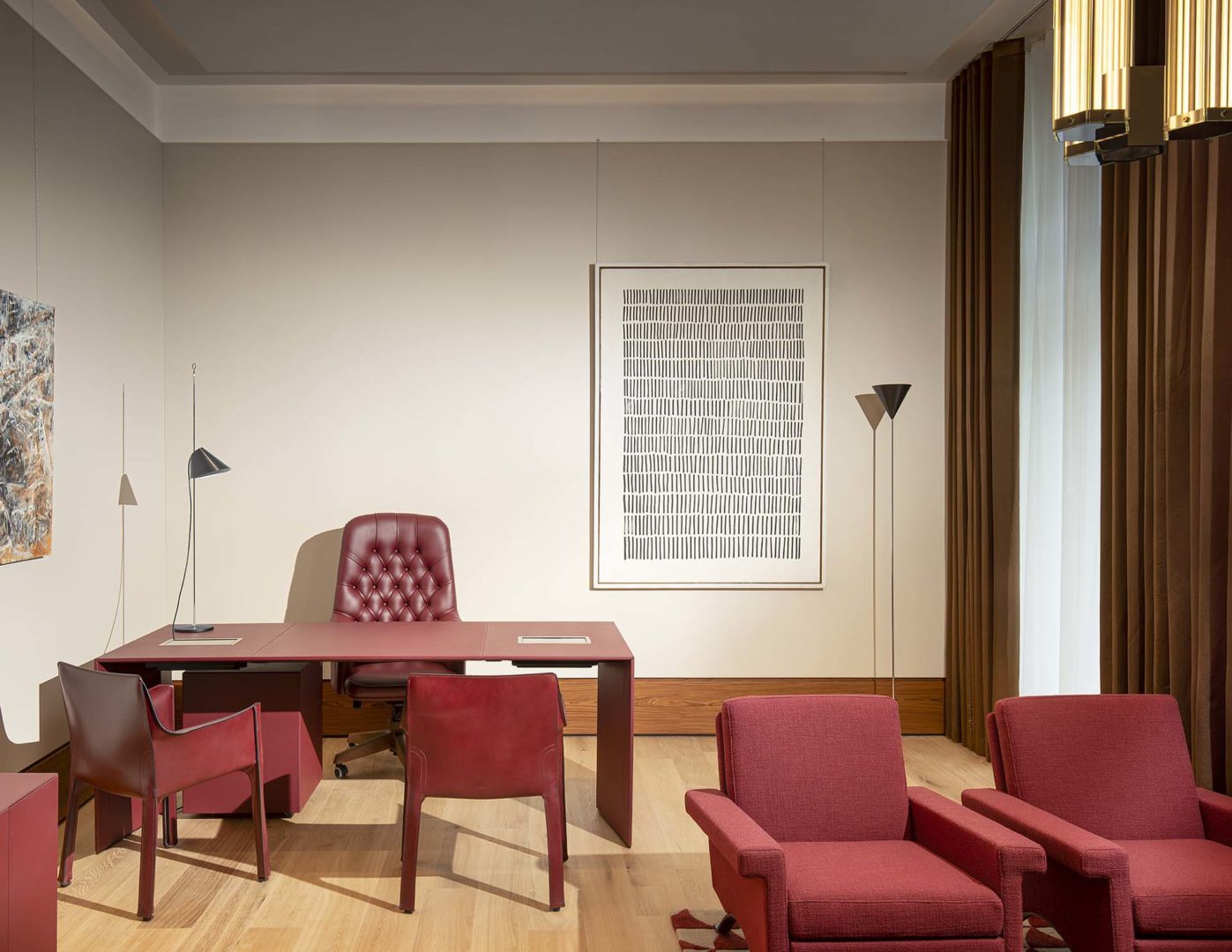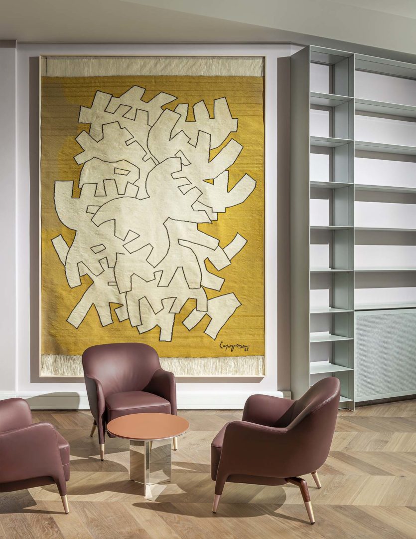 Il risultato è una sequenza di ambienti distinti ma uniti da un linguaggio coerente, dove il parquet Listone Giordano diventa elemento strutturale del racconto progettuale. Gli spazi pubblici e di rappresentanza sono arredati con pezzi storici e contemporanei del design italiano, mentre la biblioteca, la sala d’attesa e l’area espositiva accolgono mostre temporanee, inaugurate da un’esposizione dedicata alle opere italiane di J. M. W. Turner.