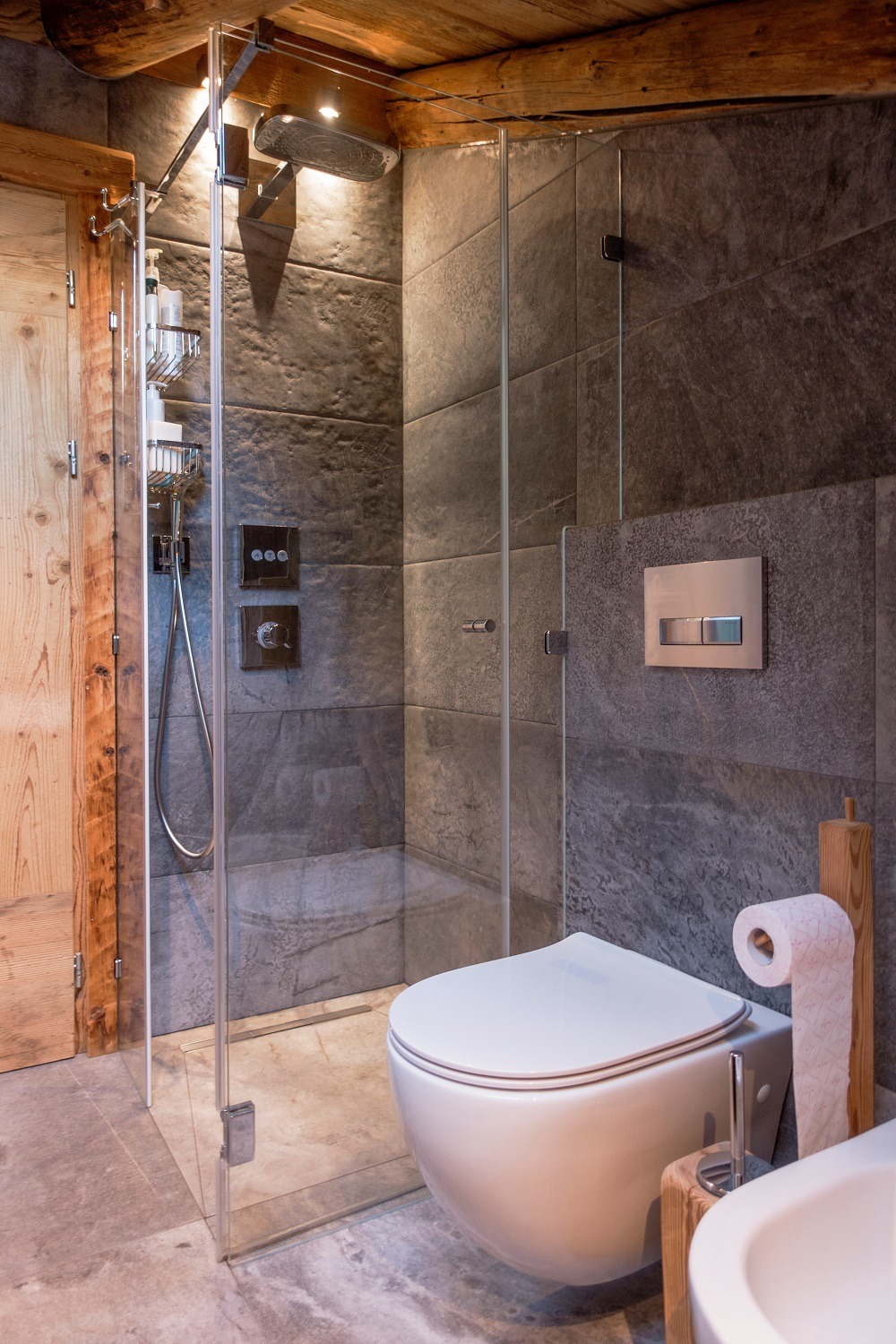 Alcuni ambienti di questa abitazione hanno visto protagonisti due prodotti a marchio Del Conca: Climb per la zona bagno e Boutique per la zona cucina, nella versione grandi lastre. Nel dettaglio, Climb è una collezione rettificata in effetto pietra disponibile in nuances chiare e grigio scure e in diversi formati: 80×80, 40×80 60×60, 30×60 nonché anche in versione due2, 20 mm, perfetta per l’esterno e per la posa a secco su ghiaia, sabbia, erba e in sopraelevato. Non mancano pezzi speciali, mosaici e decori per rendere gli ambienti più contemporanei e vissuti. Climb è un pavimento unico nel suo genere e con le sue venature in perfetto stile pietra naturale caratterizza in modo esclusivo e originale gli spazi abitativi dell’ambiente bagno integrandosi perfettamente con il legno che domina anche questo ambiente.