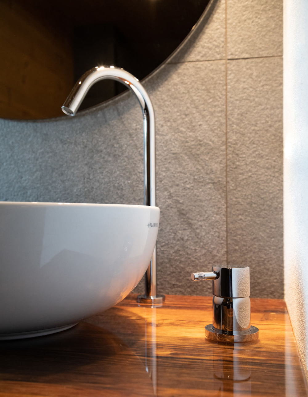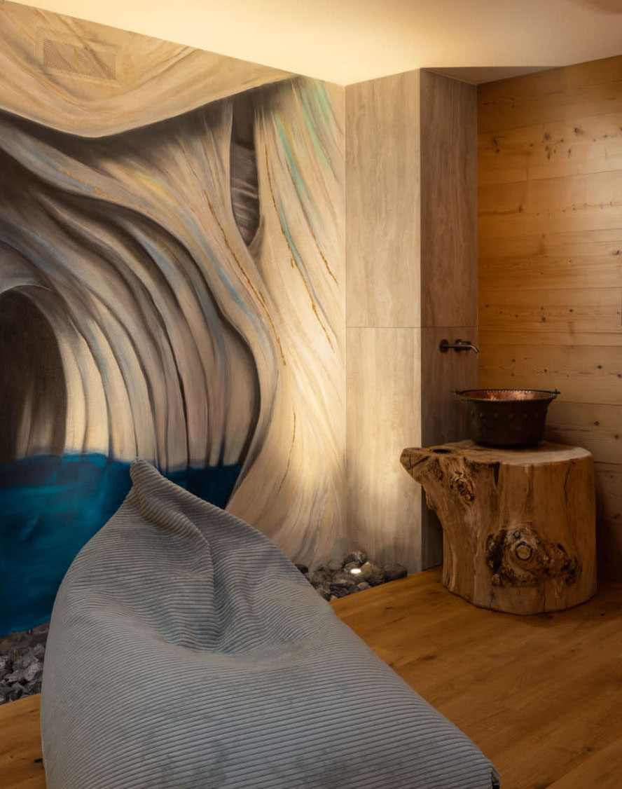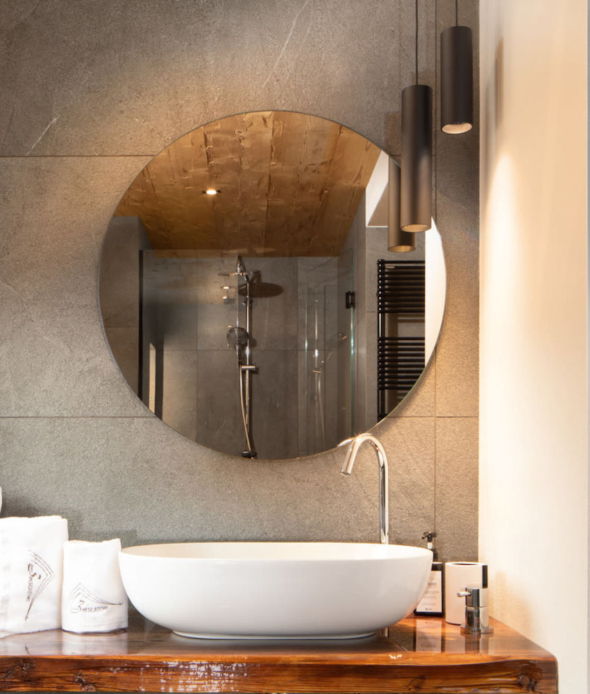Il progettista ha seguito con cura la realizzazione di ogni singolo dettaglio, in tutti gli spazi, anche nella skiroom e lavanderia, e nell’area benessere dotata di sauna, bucket shower e zona relax. Sia per la zona relax che per gli appartamenti è stata scelta la rubinetteria Diametro35 di Ritmonio, declinata nelle finiture cromo, Golden Rose e Brushed Black. Elegante e ricercata, si iscrive perfettamente nell’atmosfera familiare e montana del complesso che vede l’utilizzo del legno e la predominanza di tinte neutre e avvolgenti.