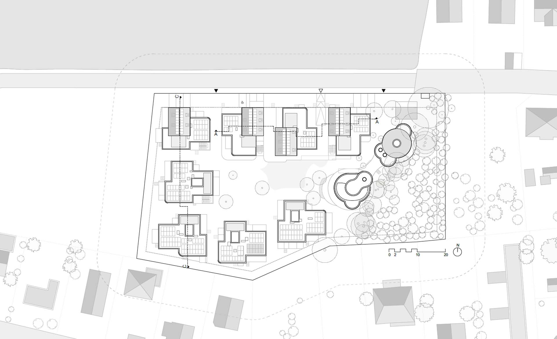 Otto edifici plurifamiliari e una common house in legno si articolano attorno a uno spazio verde centrale con area giochi e focolare, richiamando le strutture tradizionali del villaggio.