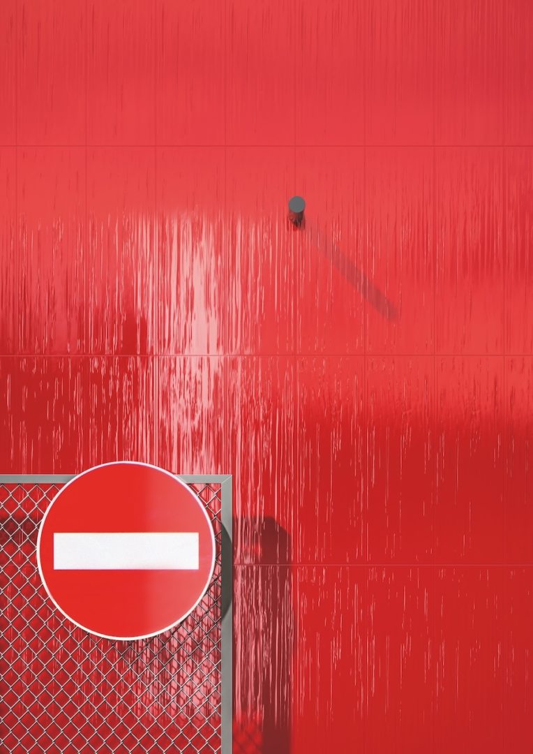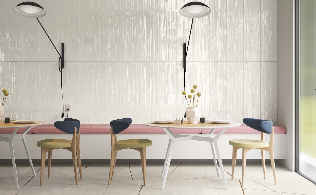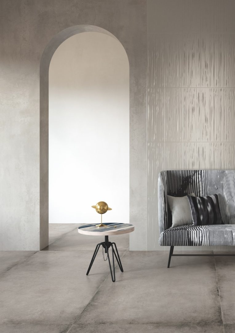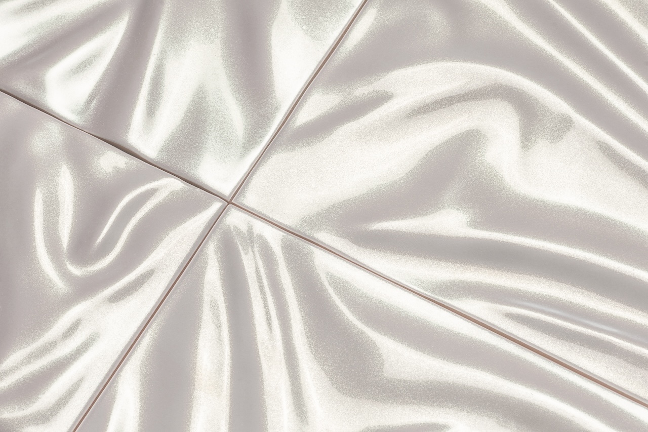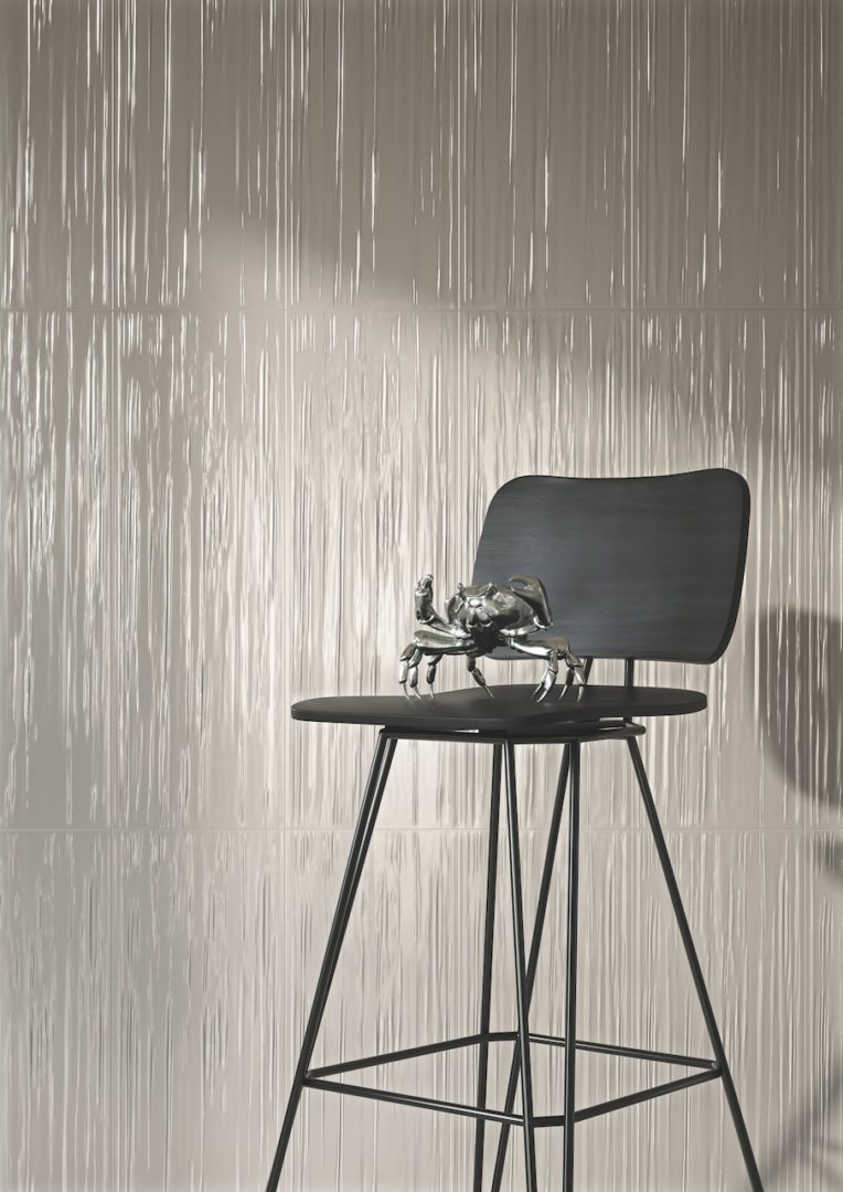 Un’indagine per immagini di spazi, luoghi e forme attraverso una superficie ceramica su cui corre un fitto reticolo di striature 3D dall’andamento sfalsato. La tattilità e la sensualità sono esaltate dalla finitura metallica per i neutri White e Steel e da quella lucida per