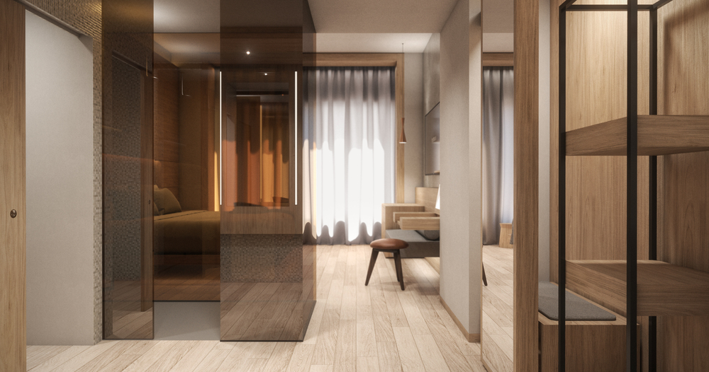Per separare la zona bagno dalla camera viene utilizzata la parete vetrata della doccia, realizzata in vetro fumè per garantire la luminosità tra i due ambienti pur evitando la totale trasparenza per garantire la privacy.