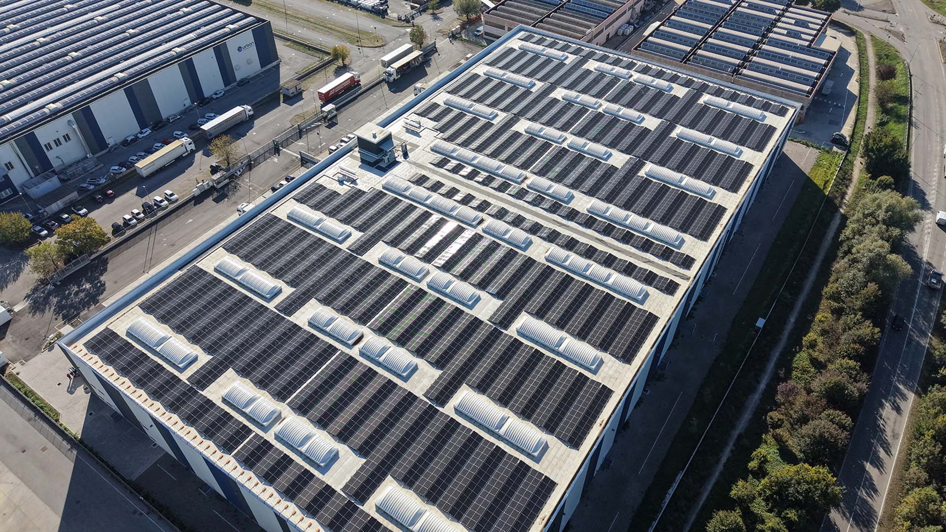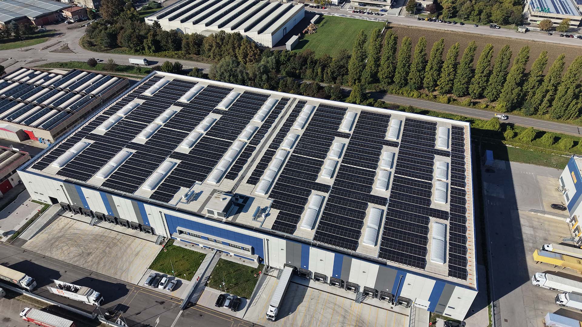 Nel nuovo polo logistico di Rolo, nel cuore della pianura padana, la copertura piana dell’edificio è stata trasformata in un grande campo fotovoltaico.