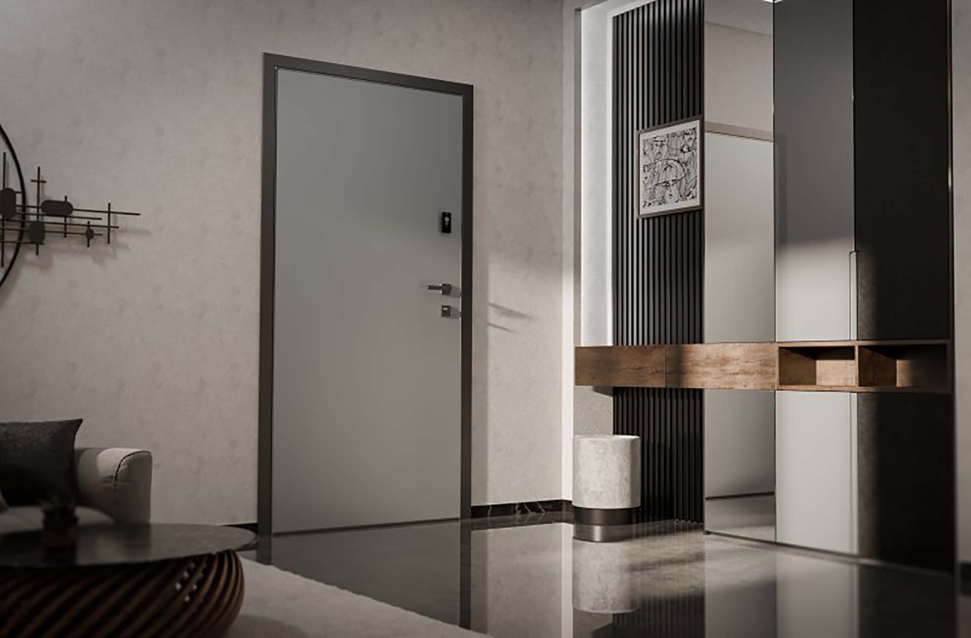 La struttura dell’anta è un concentrato di tecnologia e resistenza: una scocca a doppia lamiera in acciaio zincato a freddo racchiude uno speciale sandwich isolante sviluppato dai ricercatori Dierre, formando un monoblocco spesso appena 7,7 cm ma dalle prestazioni elevate.