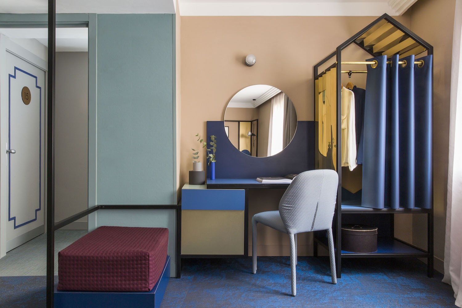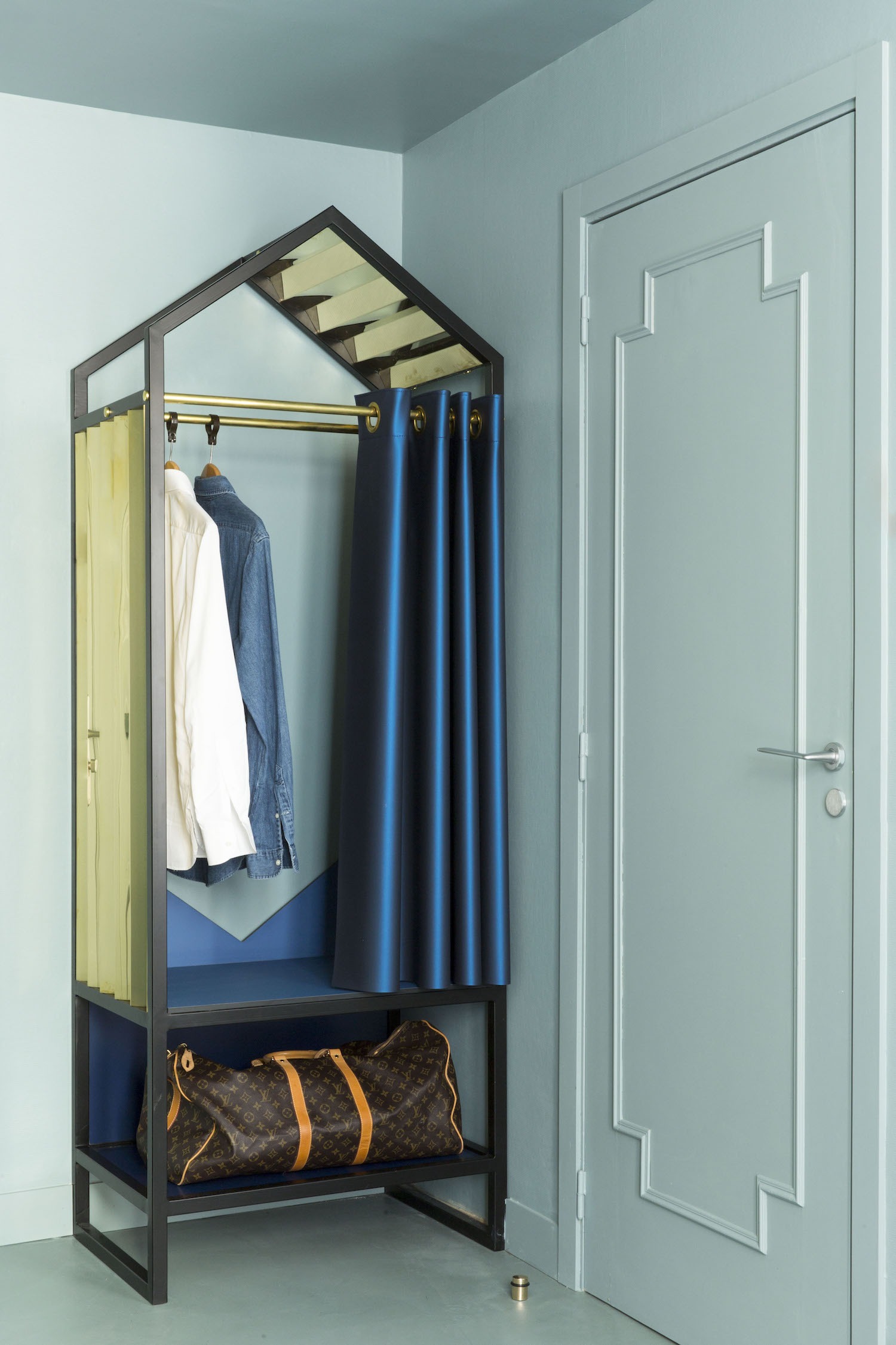 L’utilizzo di strutture metalliche, disegnate e pensate stanza per stanza, ha permesso di creare e definire degli ambienti negli ambienti, con strutture molto leggere e aeree che diventano quinta di una scenografia svolgendo però la funzione di arredo su misura. Elemento iconico del progetto è il disegno dell’armadio delle camere, la forma richiama la figura archetipica del Cabanon (firmata da Le Corbusier).