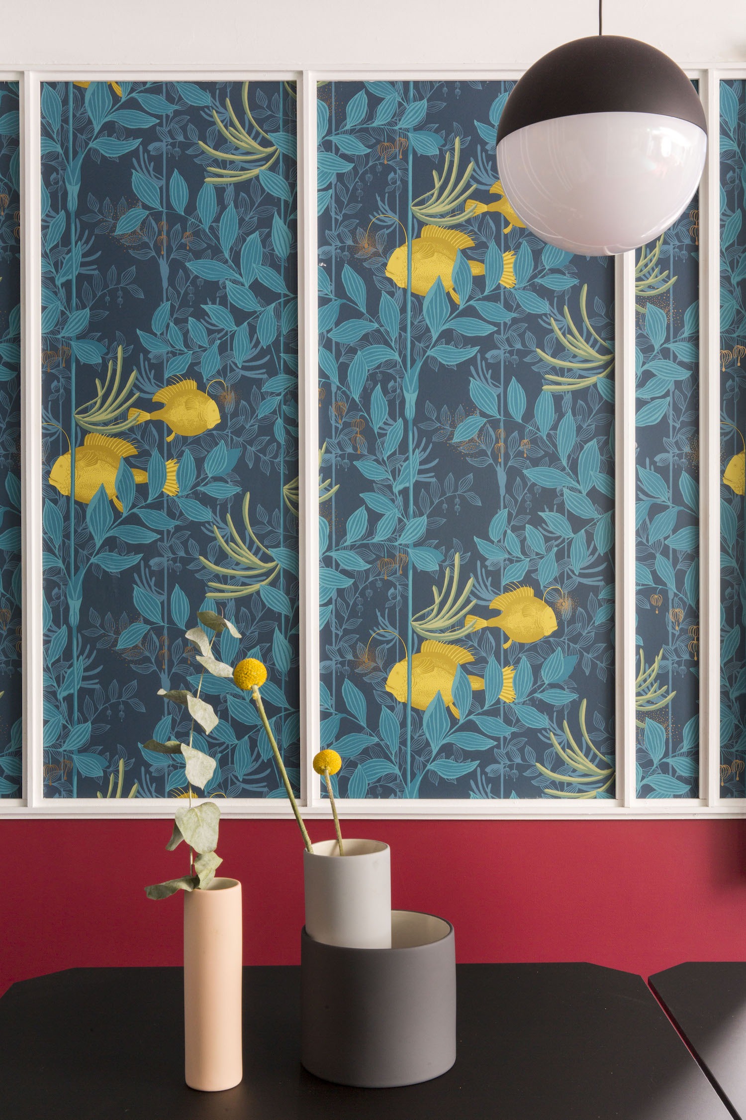 L’ospite soggiornando nell’albergo viene accompagnato in un viaggio metaforico fatto di sensazioni. Le colorazioni dei pavimenti e della carta da parati alle pareti della reception ricordano le atmosfere della promenade e portano le sue palme, la spiaggia e le sfumature del mare e del cielo all’interno dell’edificio. Scendendo al piano seminterrato, i materiali e i rivestimenti degli arredi della sala da pranzo sono nelle tonalità dell’azzurro, del blu e del verde acqua. Colori freddi, che richiamano il fondo del mare, ma sulle cui tonalità scure risaltano le forme dei pesci lanterna che sbucano tra le piante, illuminando e portando vivacità nella stanza, creando un’atmosfera carica di energia e vivacità.