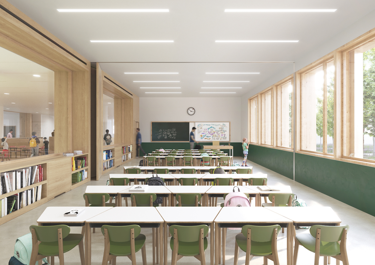 La semplicità tipologica incoraggia la lettura degli spazi interni, ottimizza l’illuminazione naturale, apre le aule verso il giardino esterno e nasconde la complessità tecnologica integrata all’architettura per nuovi ambienti altamente confortevoli.