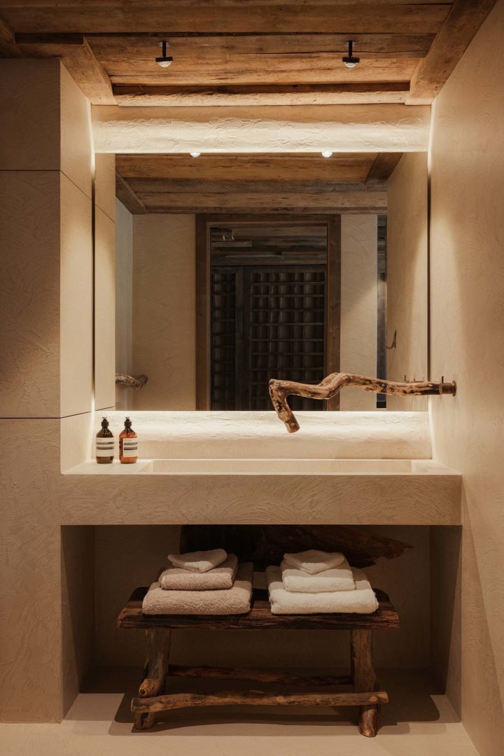 Tessuti di lino asciutti e materici rivestono letti e arredi, mentre inserti in pietra locale aggiungono solidità visiva. Gli elementi d’arredo, realizzati su misura da artigiani del territorio, raccontano un sapere antico: il grande tavolo della hall, le lampade, i tappeti, fino alle vasche da bagno scolpite da tronchi sigillati con resina.