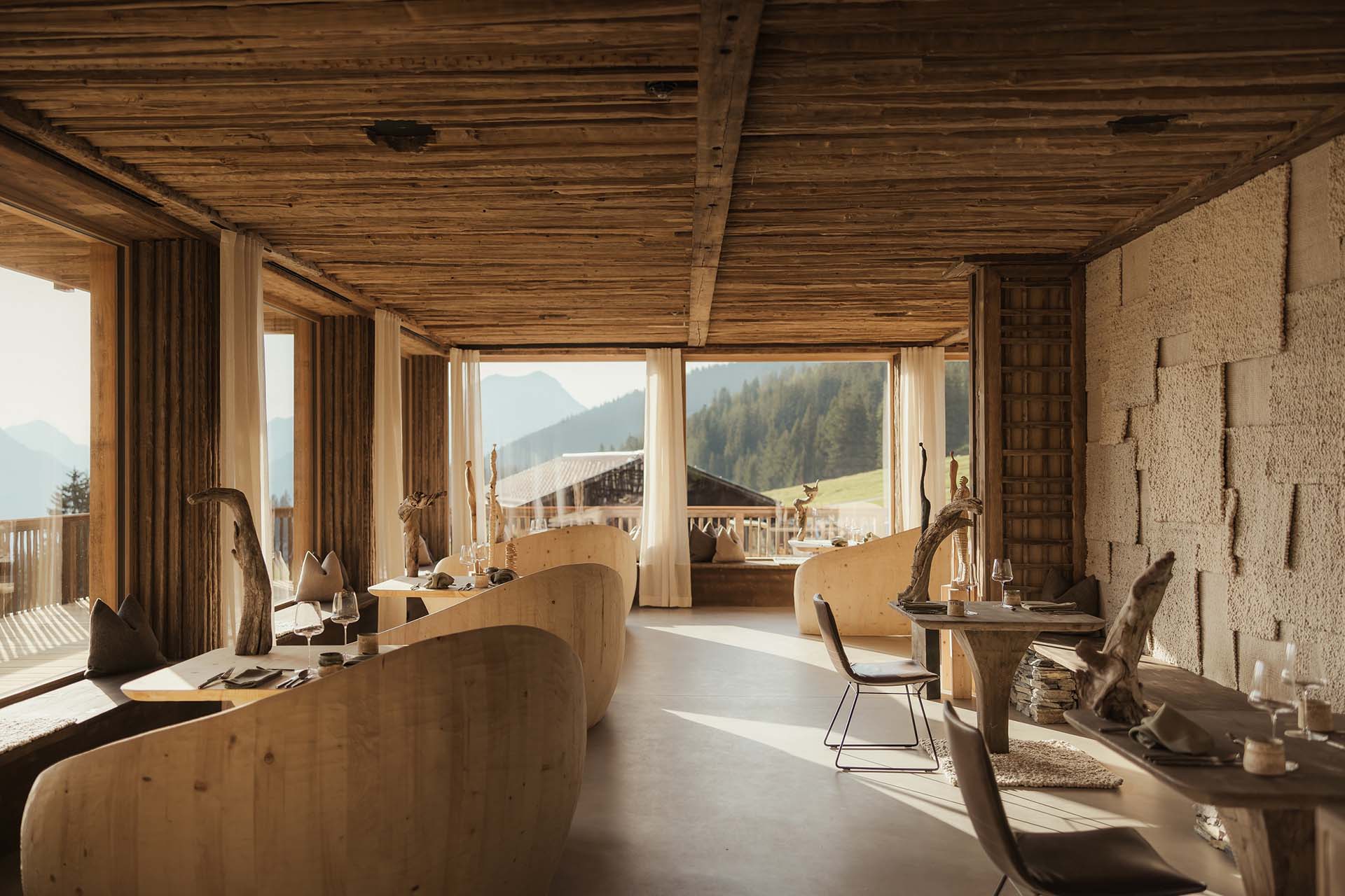 Questo principio guida l’intero progetto firmato dall’architetto Martin Gruber, che ha scelto materiali, forme e dettagli provenienti dal territorio circostante, trasformando l’hotel in un organismo coerente con il paesaggio che lo ospita.