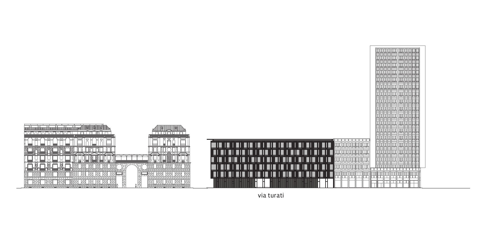 Il restyling de La Serenissima, edificio progettato nel 1962 per la Campari dai fratelli Soncin, affronta invece il tema della variazione in una facciata scansionata unicamente dal passo del telaio strutturale. Così, l’introduzione di un unico elemento che si ripete in posizioni diverse cambia la natura del prospetto, il quale, da superficie vetrata continua, si trasforma in composizione bilanciata di pieni e vuoti. Sebbene inseriti in contesti urbani diversi, che fanno di questi edifici due architetture incomparabili, possiamo tuttavia riconoscere un tratto che li accumuna, che risiede nel concepire l’involucro come una superficie unica, un fronte saturo che gira sui lati senza soluzione di continuità, siano essi parte di un oggetto isolato, che parte di un isolato urbano. Per la finestra come elemento di impaginazione del prospetto, che trova a Milano un fecondo filone con il lavoro di Lingeri, Asnago e Vender, Caccia Dominioni ed altri, non c’è posto nelle facciate di Park Associati, i quali sembrano richiamare piuttosto le trame ordite da Figini e Pollini e Mangiarotti nello loro pelli tridimensionali.