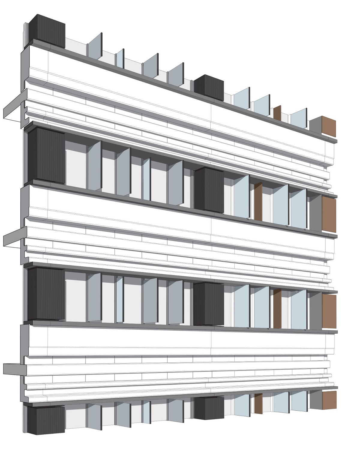 L’operazione di Park Associati consiste nel mettere in evidenza tale orizzontalità, giocando sulla tridimensionalità del prospetto. L’inserimento di elementi verticali che proiettano ombre sui serramenti aumenta l’effetto ritmico e finisce per enfatizzare la continuità delle parti opache, sagomate su un profilo che corre lungo tutto il perimetro. Infatti, il passo dei serramenti è sottolineato all’interno da pinne in vetro extrachiaro che ne aumentano la flessibilità permettendo l’installazione di pareti mobili. All’esterno le pinne si alternano in vetro extrachiaro e colorato in pasta grigio chiaro. Davanti ai pilastri si trovano box in lamiera microforata pressopiegata, a ripartire ulteriormente le strisce orizzontali.
