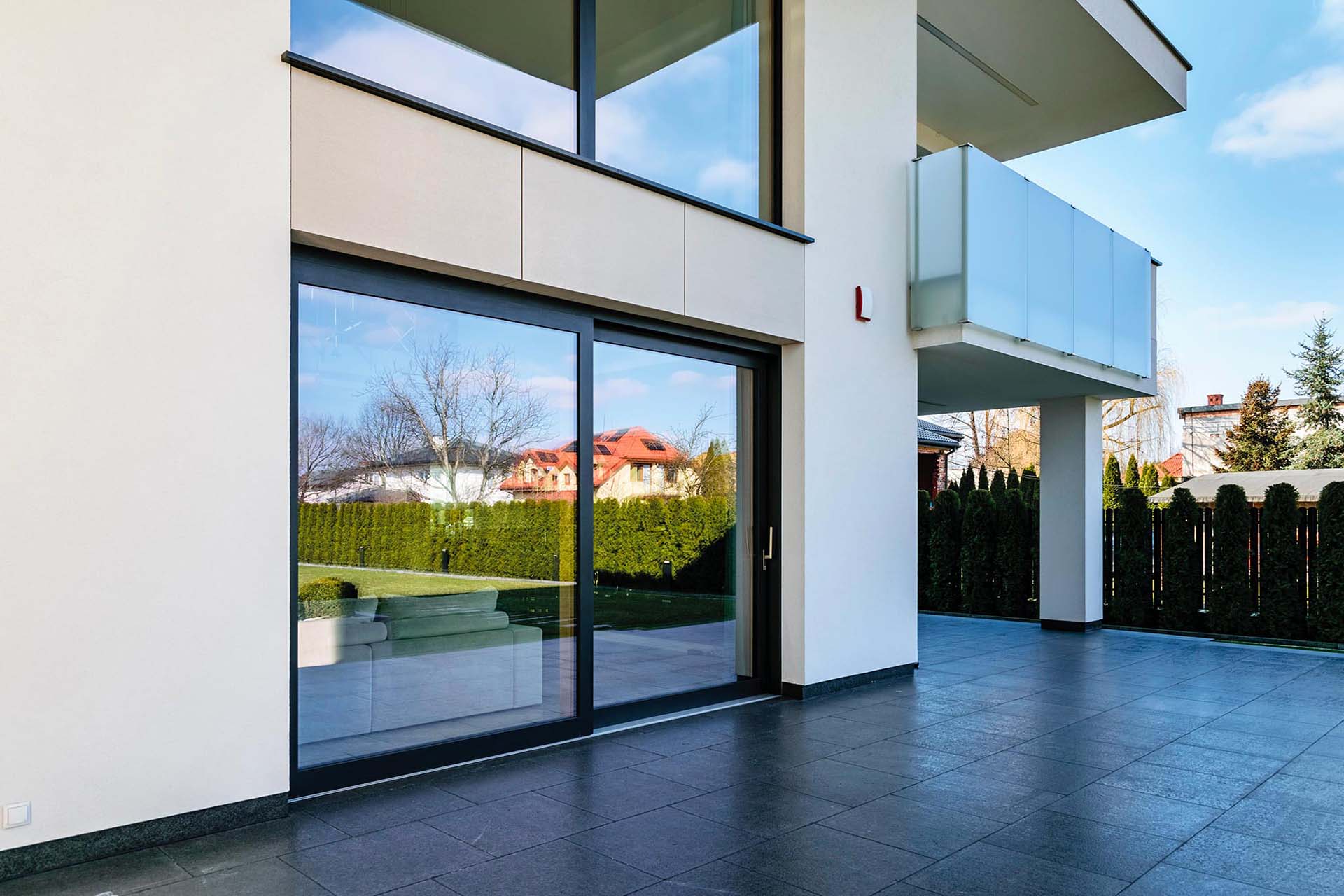 Le geometrie rigorose delle aperture sono messe in risalto dai profili scuri di porte e finestre, che non solo definiscono l’estetica dell’edificio, ma ne rappresentano anche il cuore tecnologico.