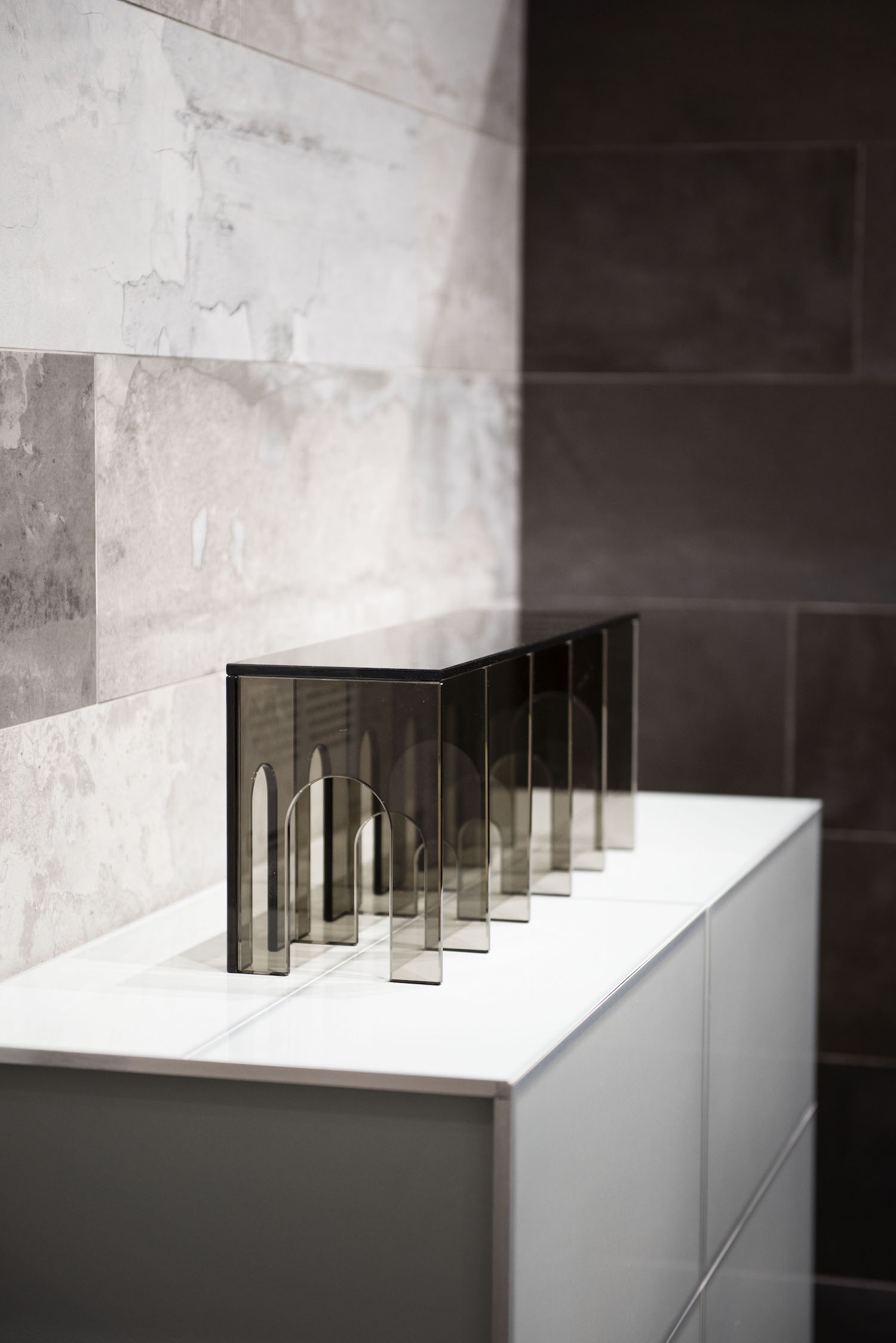 Da questa ispirazione nascono la collezione in grés porcellanato Vetri di Ceramiche Refin e le creazioni dei giovani talenti di Istituto Marangoni – The School of Design, che hanno accolto la sfida di disegnare una serie di prodotti capaci di innescare una connessione narrativa tra riflessione e rappresentazione. Eccoli di seguito: Arc di Matteo Agati, Equilibrio di Chiara Castagnoli e Martina Ivaldi, Ponte di Térence Coton, City di Roberto Di Stefano, Fumè di Arthur Gentil, Monumento di Gustavo Martini, Oggi di Giulio Masciocchi, Grattacielo di Malika Novi, Corridoio di Maria Camilla Scalf.