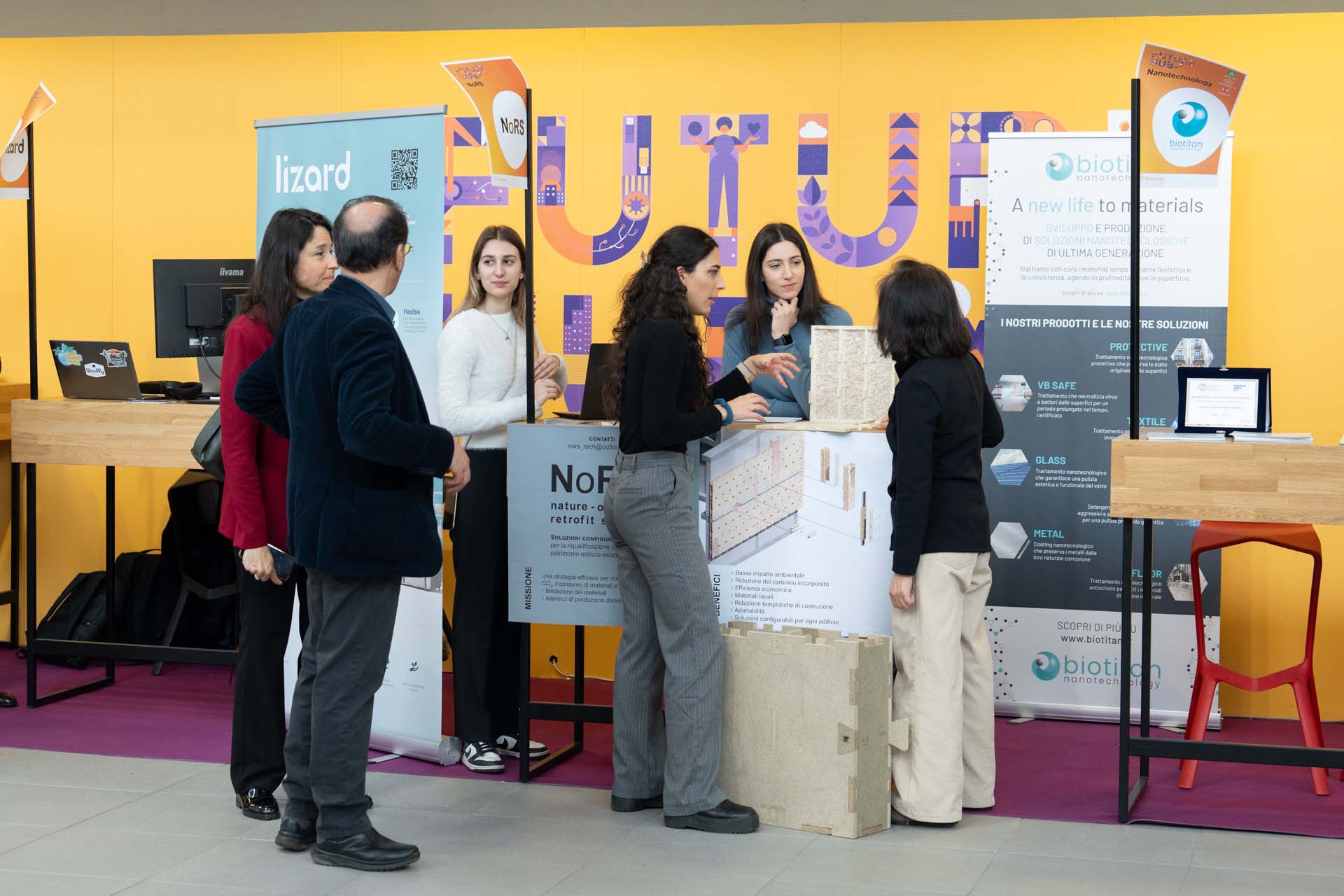Materiali innovativi per l’edilizia, con soluzioni che migliorano le prestazioni degli edifici attraverso sistemi modulari sostenibili e materiali fotocatalitici capaci di abbattere gli inquinanti.