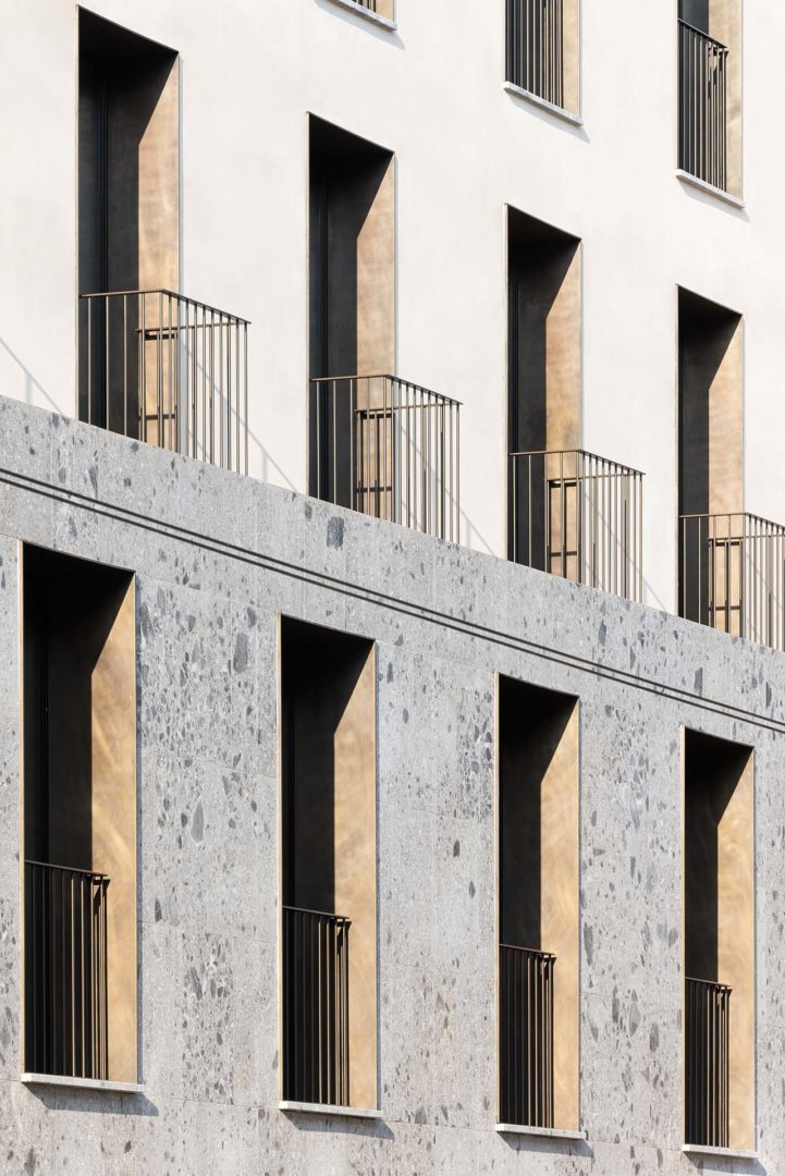 La facciata presenta imbotti in ottone che incorniciano le aperture, il basamento in Ceppo di Gré e la copertura in coppi di cotto di Possagno completano il dialogo con il contesto urbano e la preesistenza monumentale.