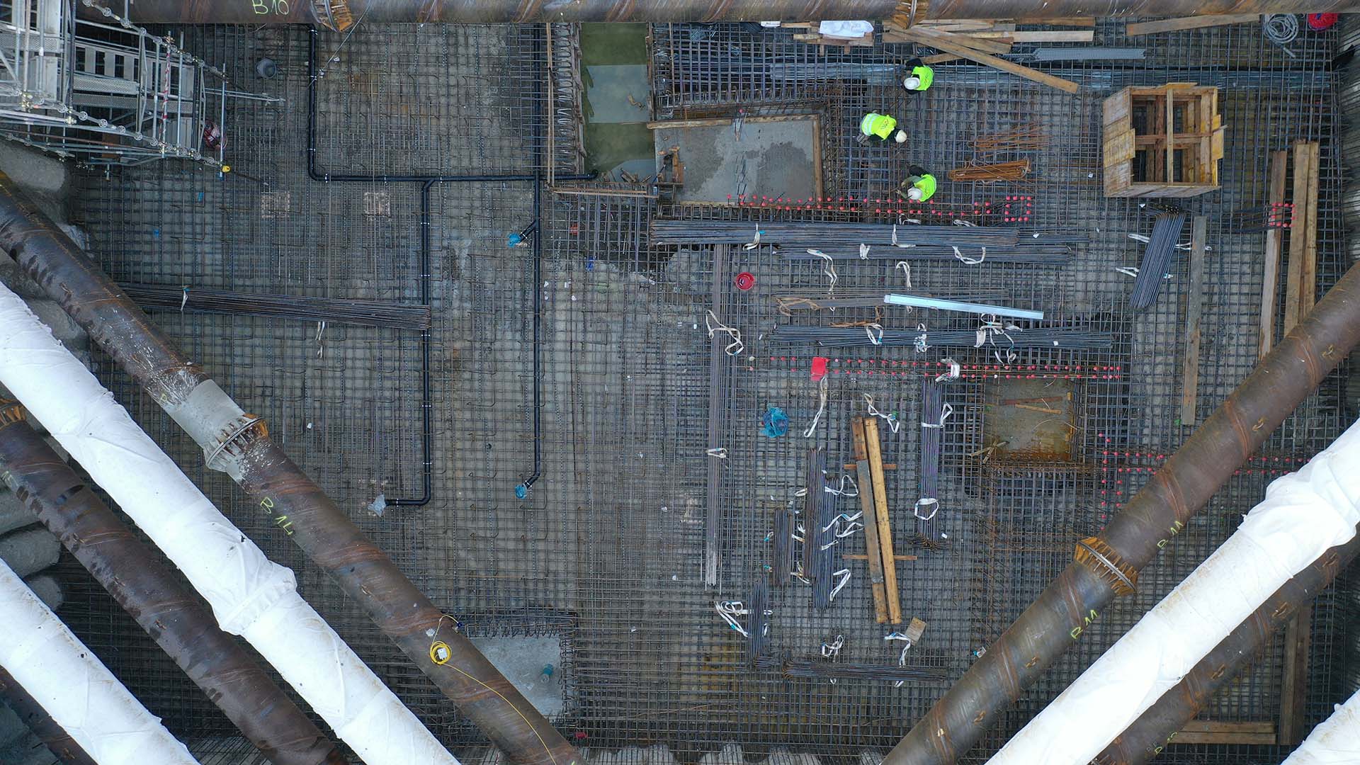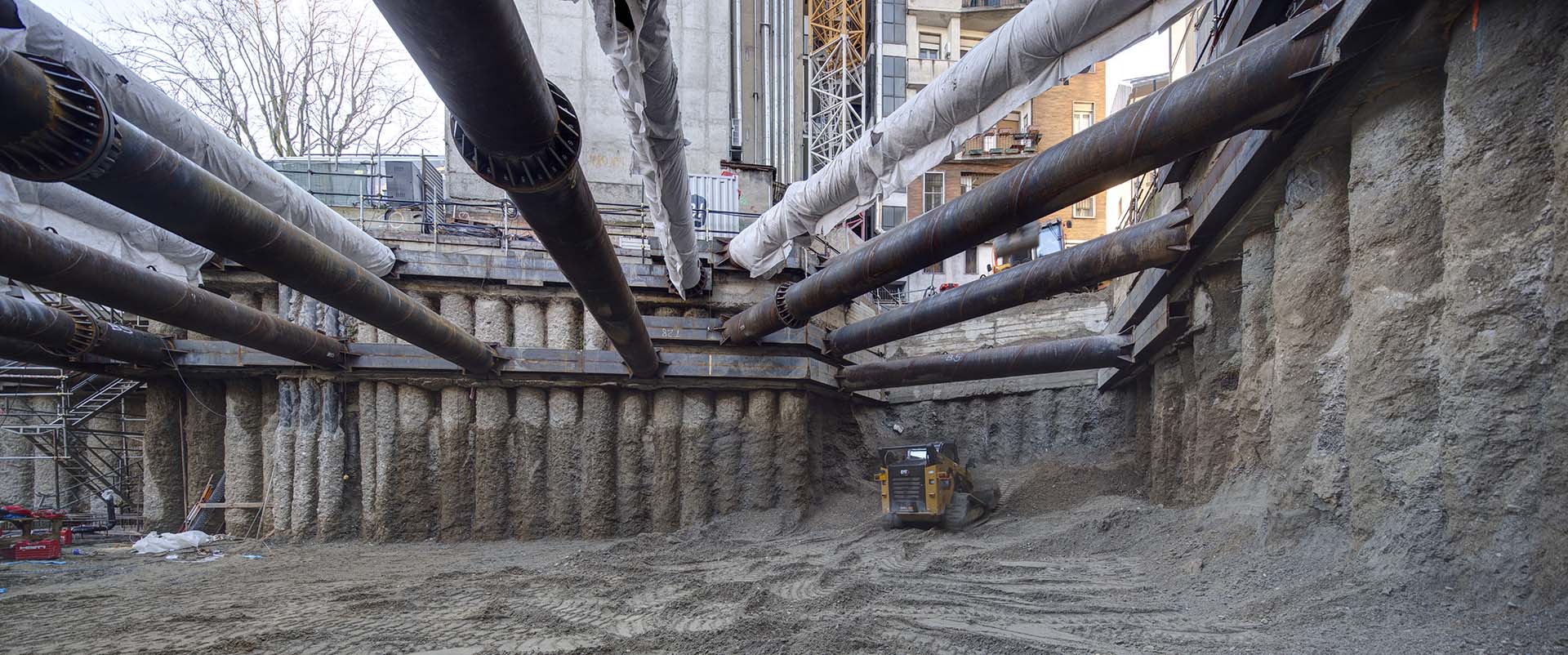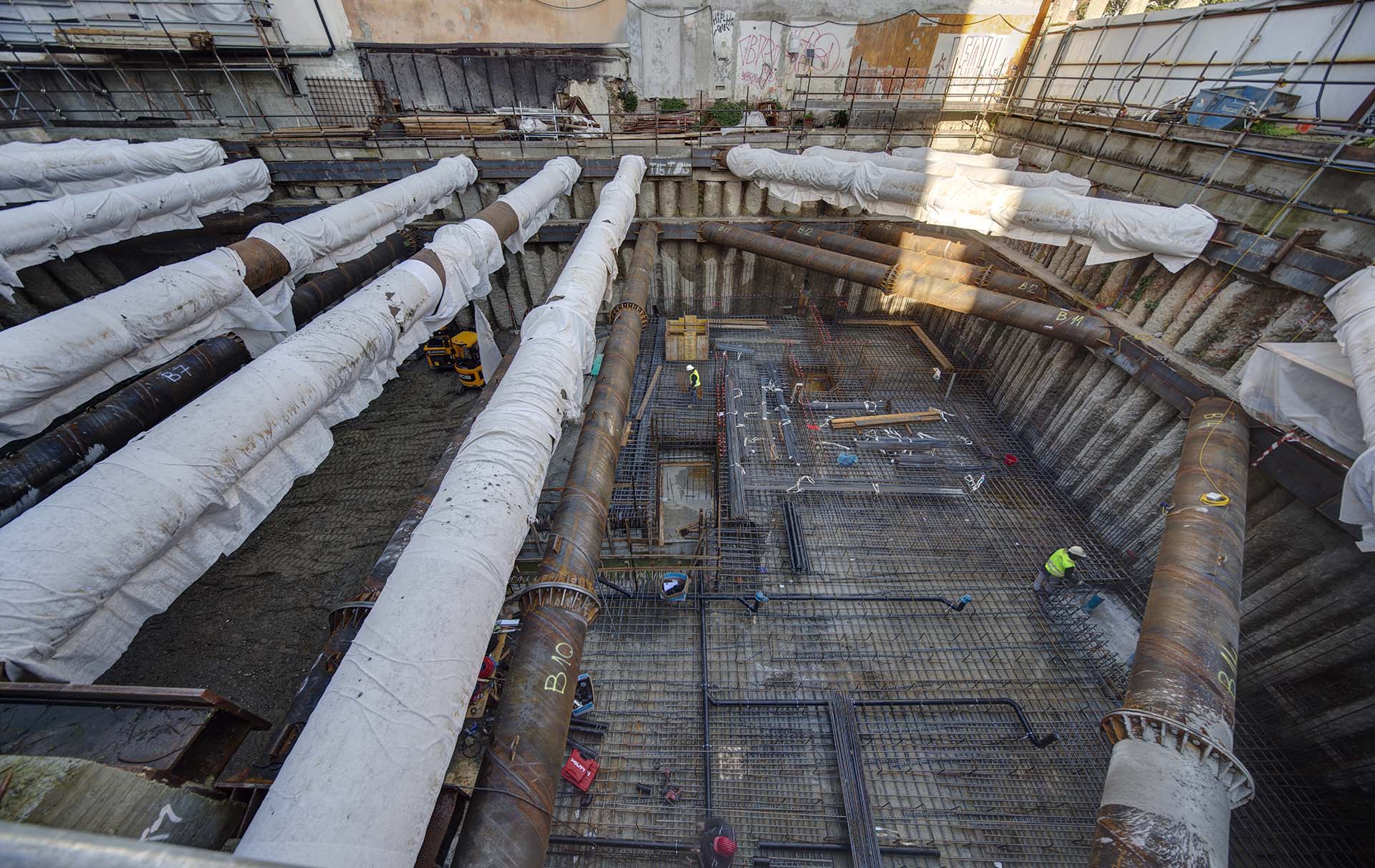 Al termine della costruzione della fondazione e dei solai interrati sono stati rimossi i vari ordini di puntoni metallici (aventi un diametro di 813 mm) messi in opera durante le operazioni di scavo.