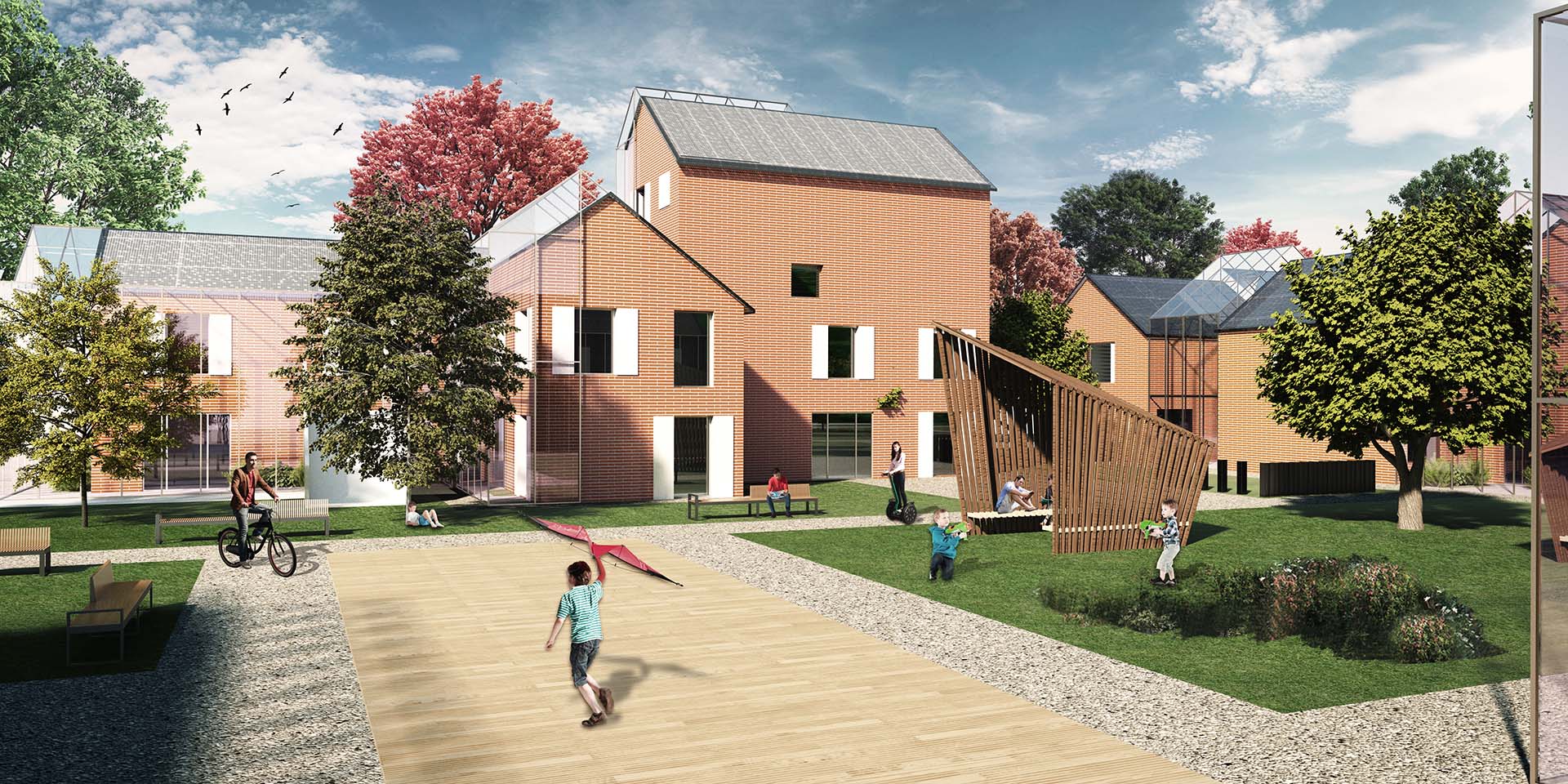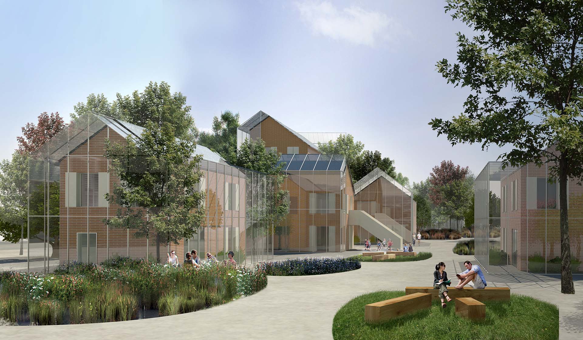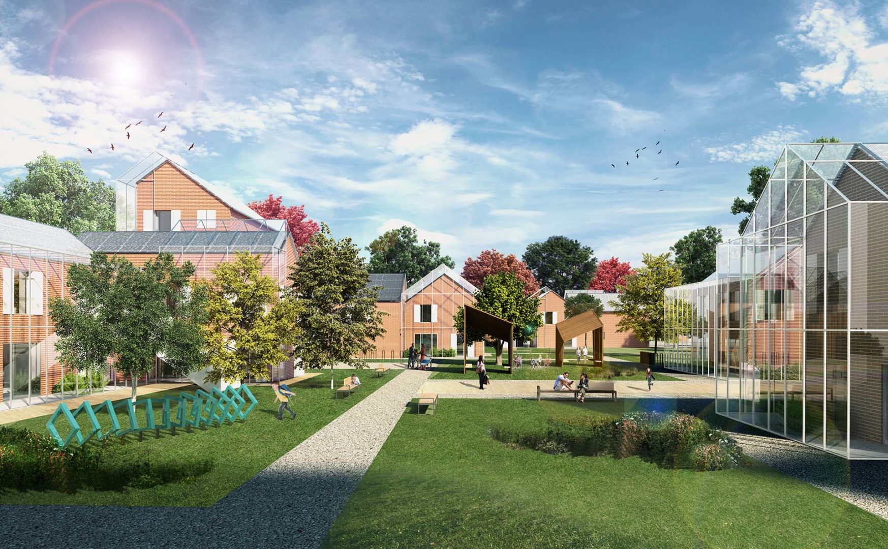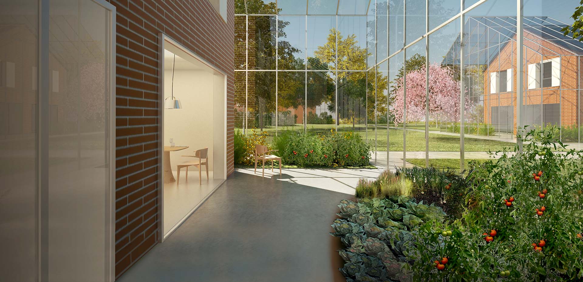 Ogni unità abitativa dispone di spazi verdi dedicati, mentre serre integrate e giardini comuni incentivano l’orticoltura urbana e il senso di comunità.