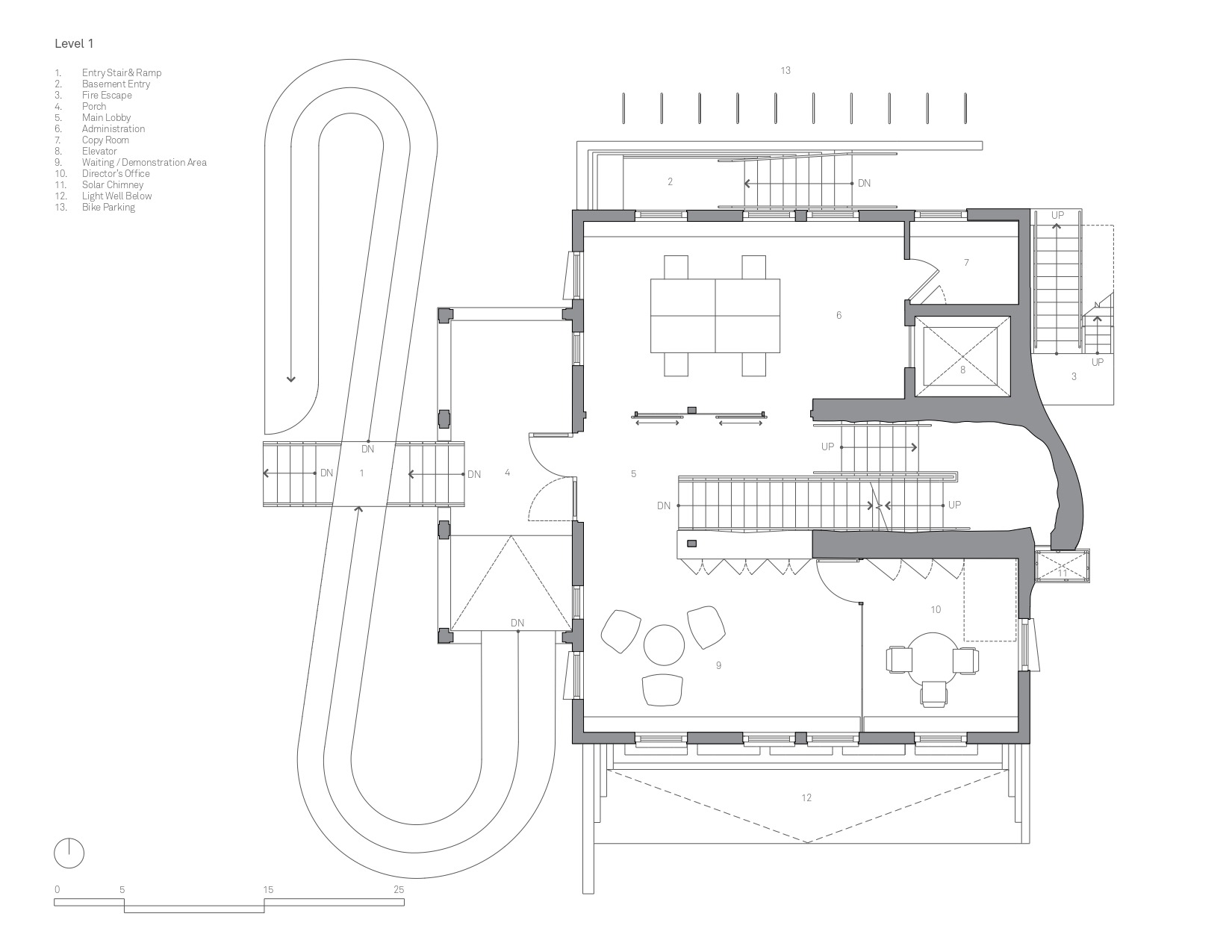Al centro dell’edificio, una scala sfaccettata si sviluppa a spirale attraverso tutti e quattro i piani dell’edificio