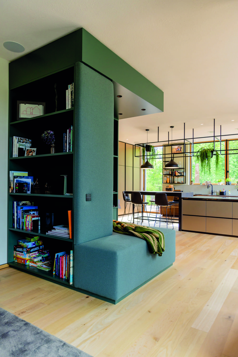 L’ampia zona giorno e sala da pranzo è il punto focale della casa: d’inverno è un luogo accogliente e confortevole dove ritrovarsi davanti al camino, mentre d’estate le grandi porte scorrevoli si aprono verso l’esterno, un giardino circondato da  alberi e con una spaziosa piscina naturale privata.