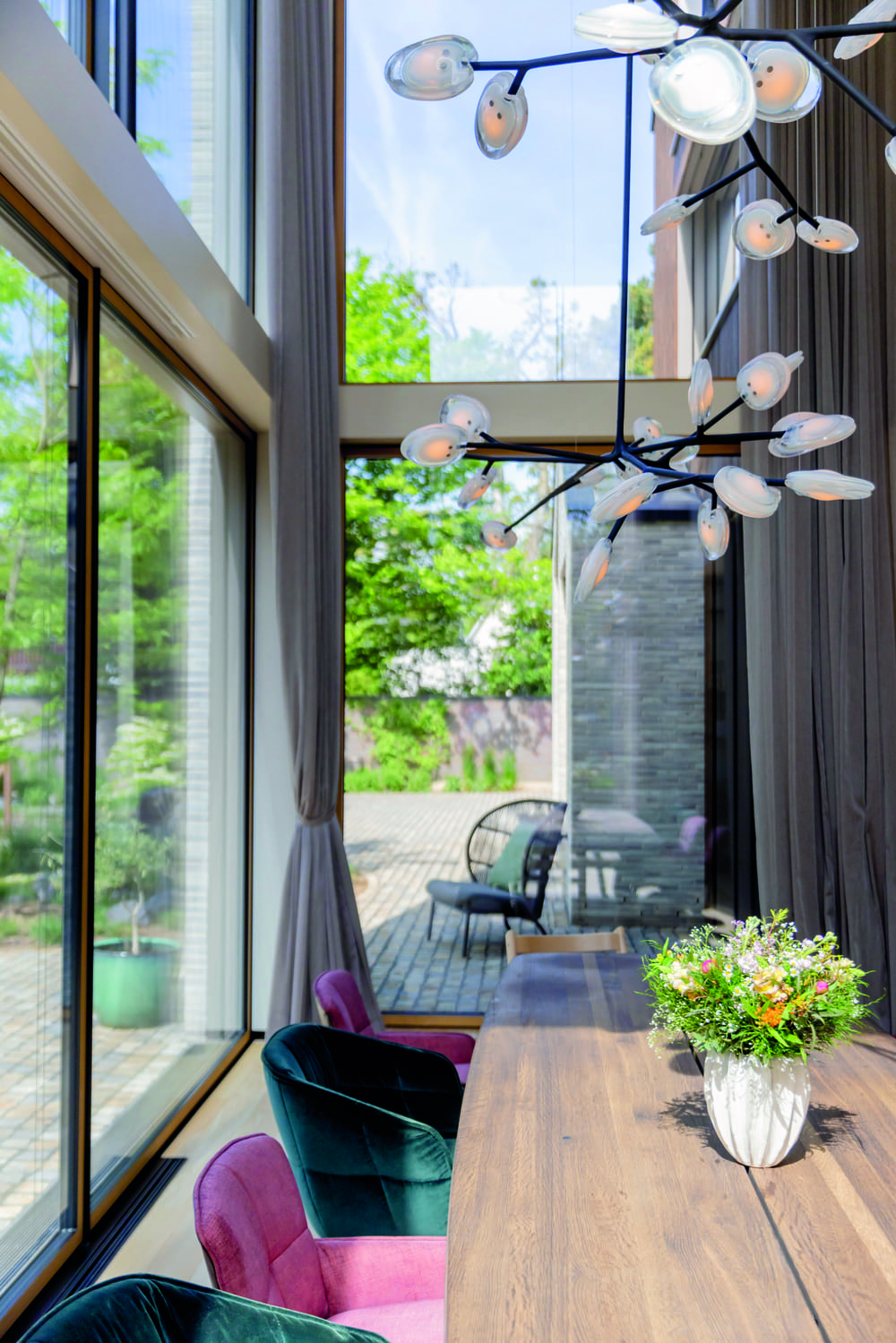 Gli interni presentano un interessante e variegato mix di colori e materiali. Tra le peculiarità del progetto figurano carte da parati insieme a elementi tessili insoliti, arredi su misura e sistemi di illuminazione capaci di adattarsi perfettamente alle singole stanze.