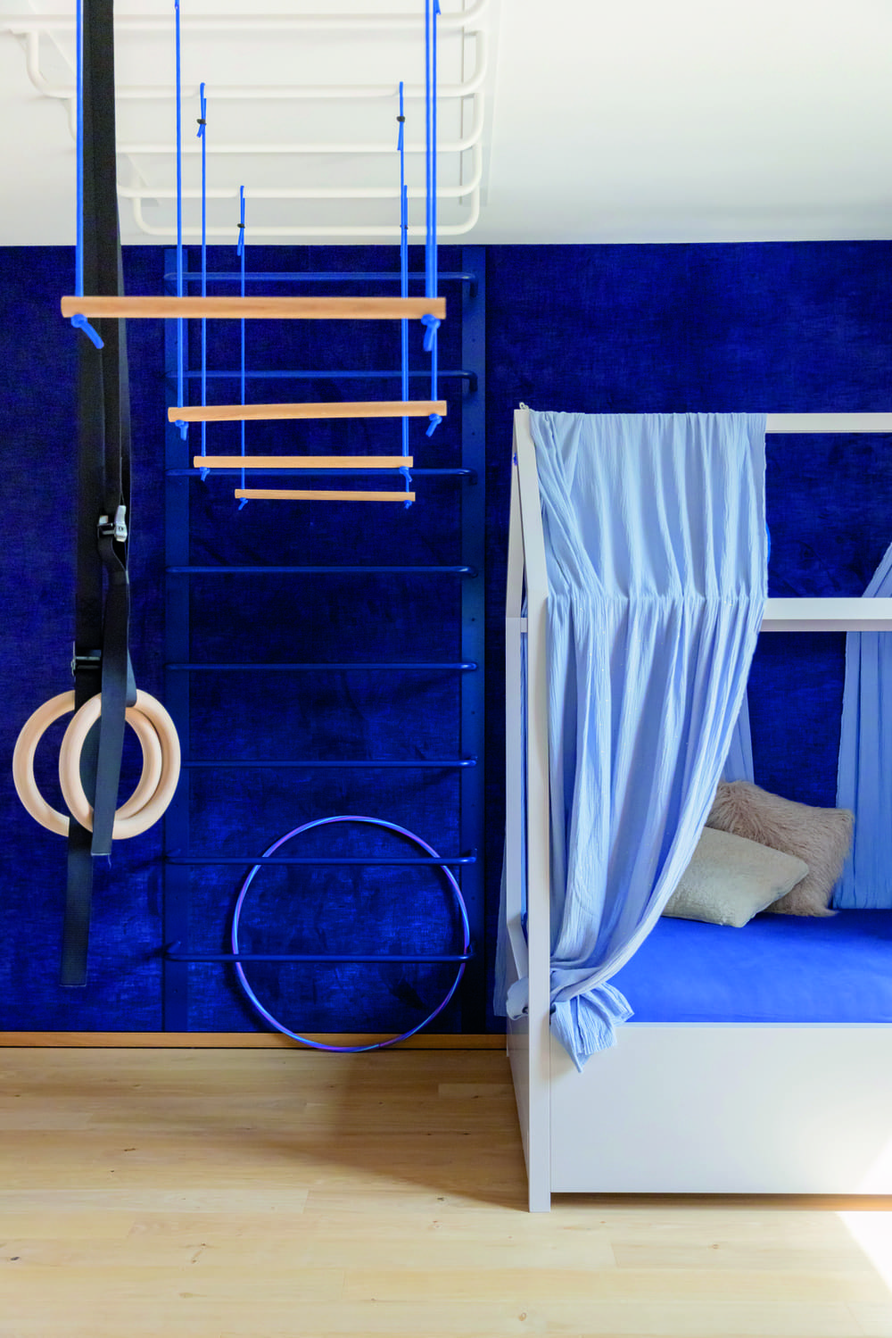 Il design dinamico e originale caratterizza anche le camere da letto e i bagni, anche quello dei bambini dove si alternano i toni del blu e del bianco, mentre le pareti sono caratterizzate dalla raffinata carta da parati che riproduce delle gru in un canneto. I miscelatori a due fori a parete Meta di Dornbracht, nella finitura nero opaco, conferiscono eleganza all’ambiente e offrono un bel contrasto con i rivestimenti blu oceano.