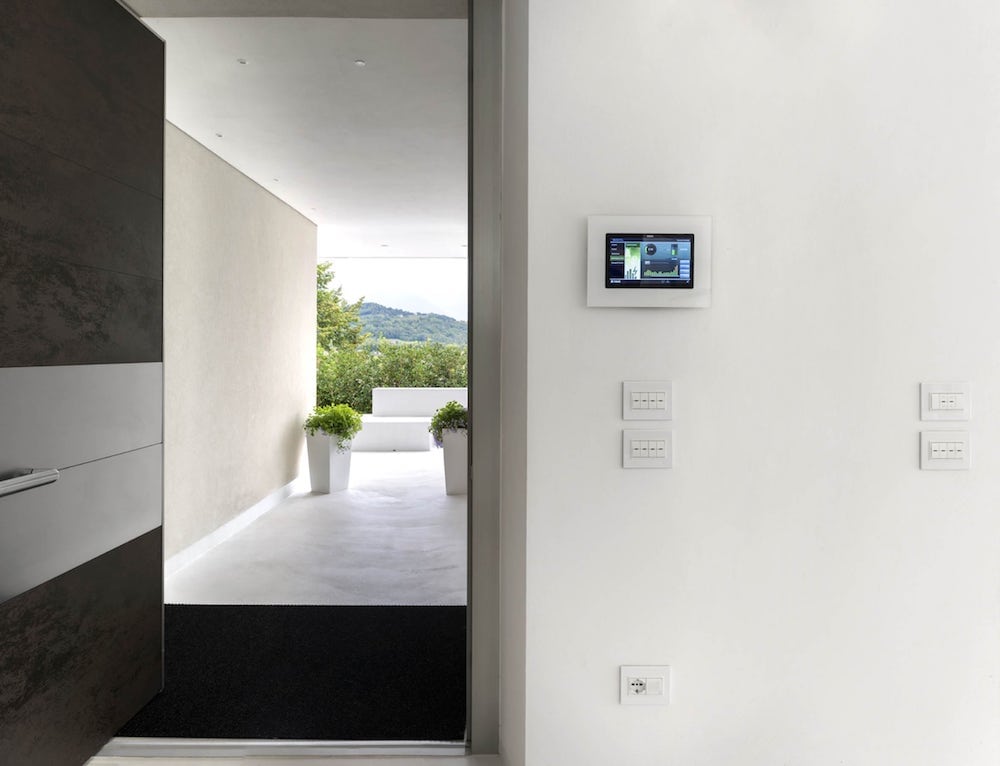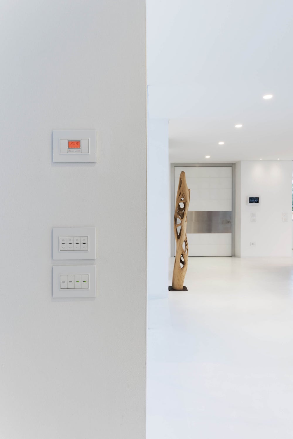 In questo caso sono stati installati due Multimedia video touch: basta sfiorare il loro schermo per richiamare, in pochi istanti e per ogni stanza della casa, una diversa combinazione di temperatura, illuminazione e comfort, precedentemente configurata. Questi due dispositivi assolvono anche alla funzione di videocitofono.