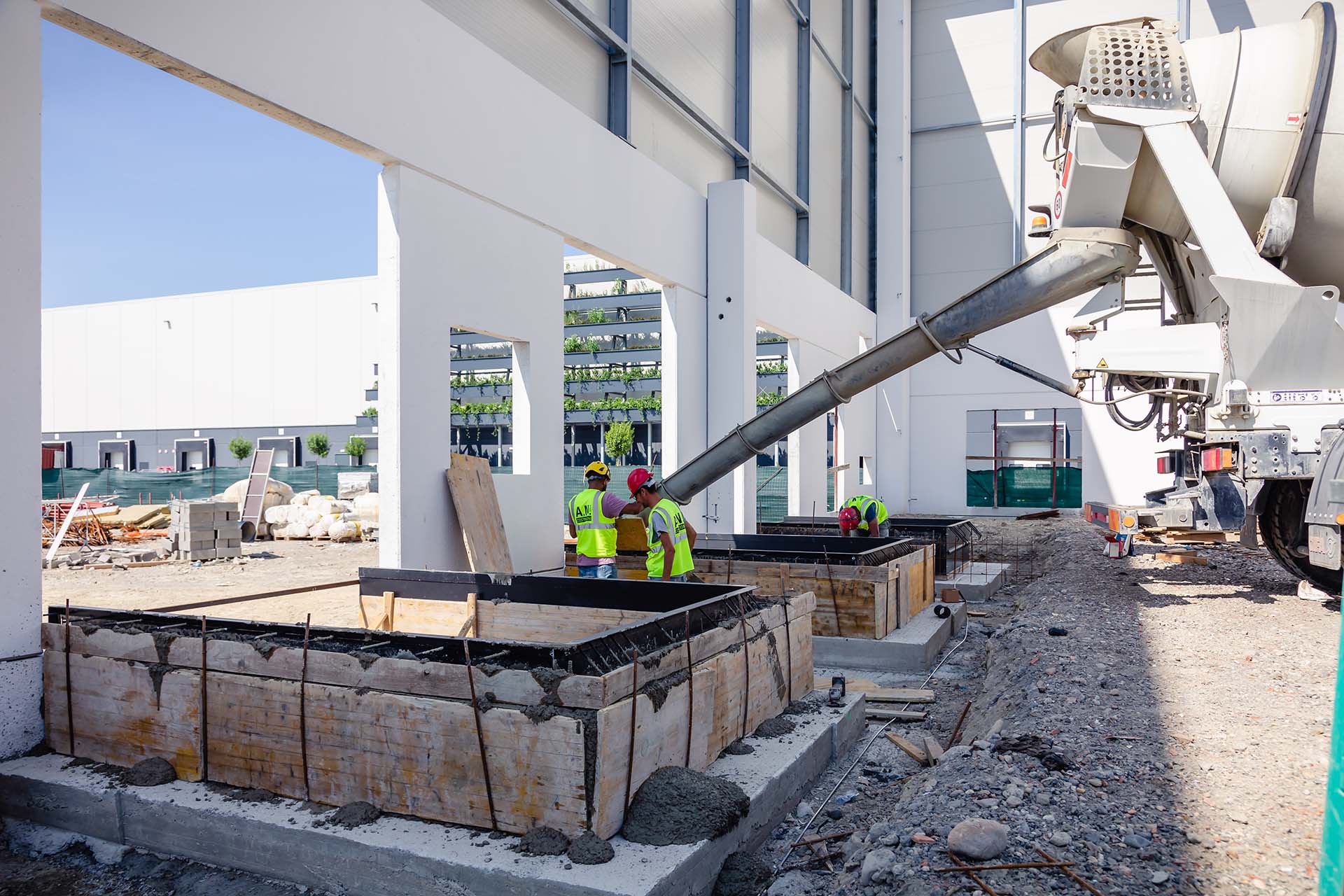 Ai pilastri sono state appoggiate le travi, anch’esse di tipo prefabbricato, a cui è seguita la predisposizione dei componenti del solaio, il posizionamento dei ferri integrativi e delle reti elettrosaldate e, infine, il getto di integrazione degli elementi strutturali.